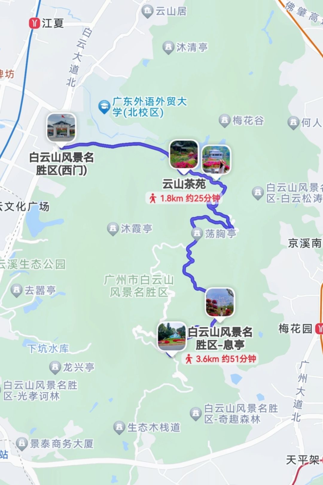 白云山西门➠ 云山茶苑➠ 蒲林草坪➠ 明珠湖➠ 息亭➠ 山顶广场(到山顶广场可乘坐索道或电瓶车下山)