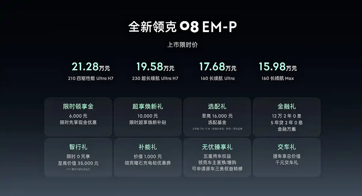 9月24日,新款领克08 EM-P正式上市了,新车共推出四款车型,售价区间为17.58-22.88万元,同时官方还给了限时价15.98-21.28万元。据悉,新车定位中型SUV,采用插混动力。另外,新车还标配了激光雷达,并且两个高配版还配了最新的索尔芯片。至于新车如何,我们接着看下去。