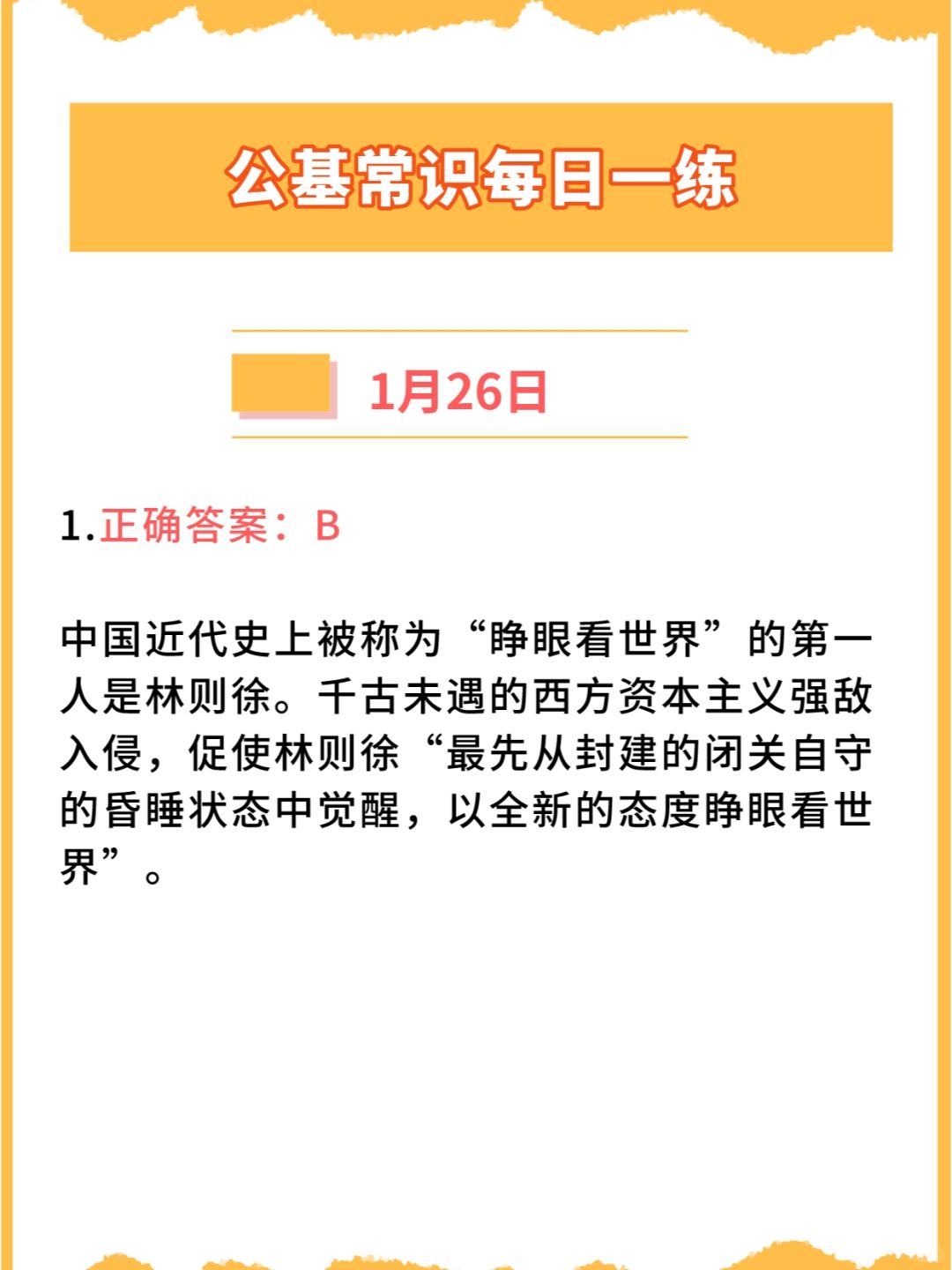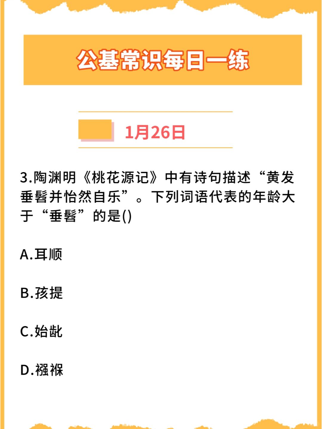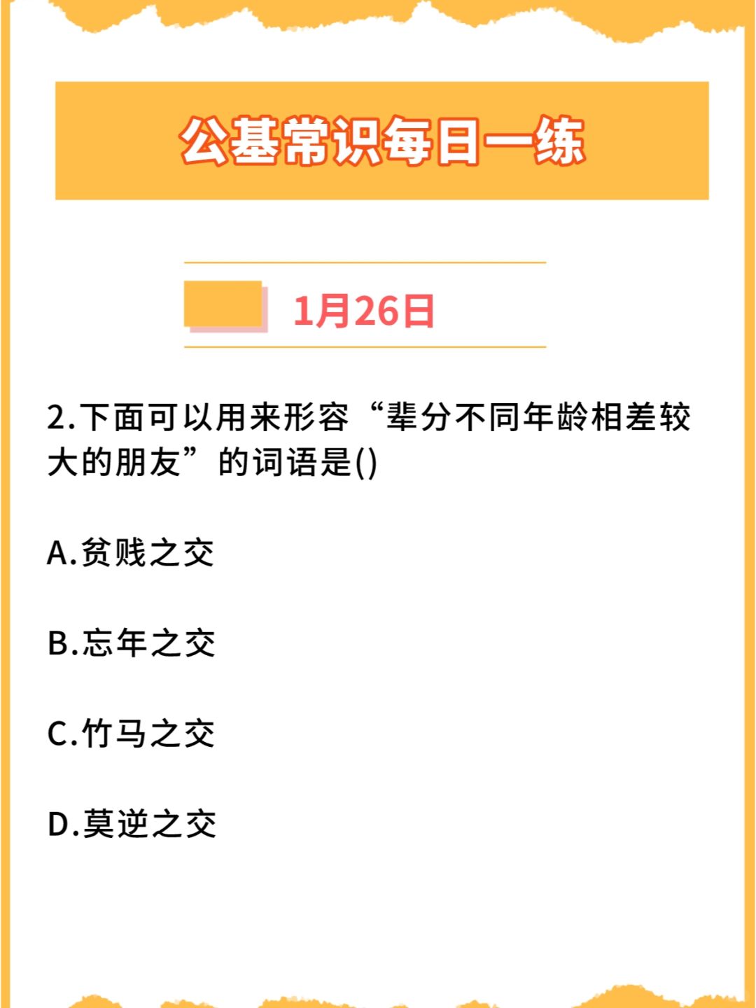 1.中国近代史上,被称为“开眼看世界”第一人的是() A.李鸿章 B.林则徐 C.康有为 D.严复 2.下面可以用来形容“辈分不同年龄相差较大的朋友”的词语是() A.贫贱之交 B.忘年之交 C.竹马之交 D.莫逆之交 3.陶渊明《桃花源记》中有诗句描述“黄发垂髫并怡然自乐”。下列词语代表的年龄大于“垂髫”的是() A.耳顺 B.孩提 C.始龀 D.襁褓