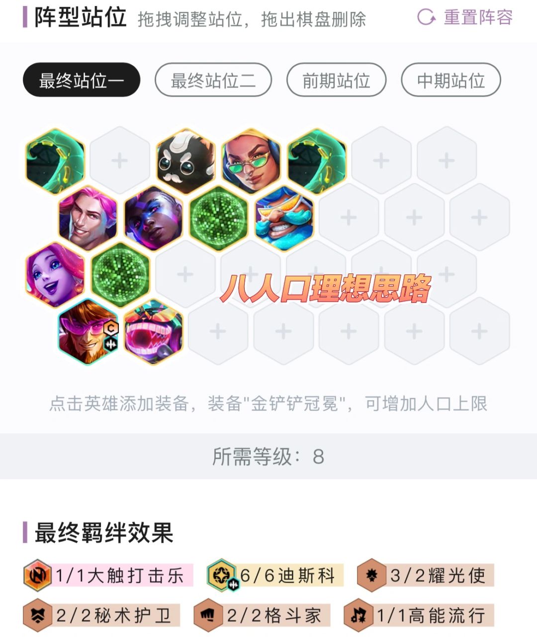 八人口把紫卡全部抽到二星,关键橙卡找一张,或者用替补紫卡全二星能锁血就存钱上九完整阵容。