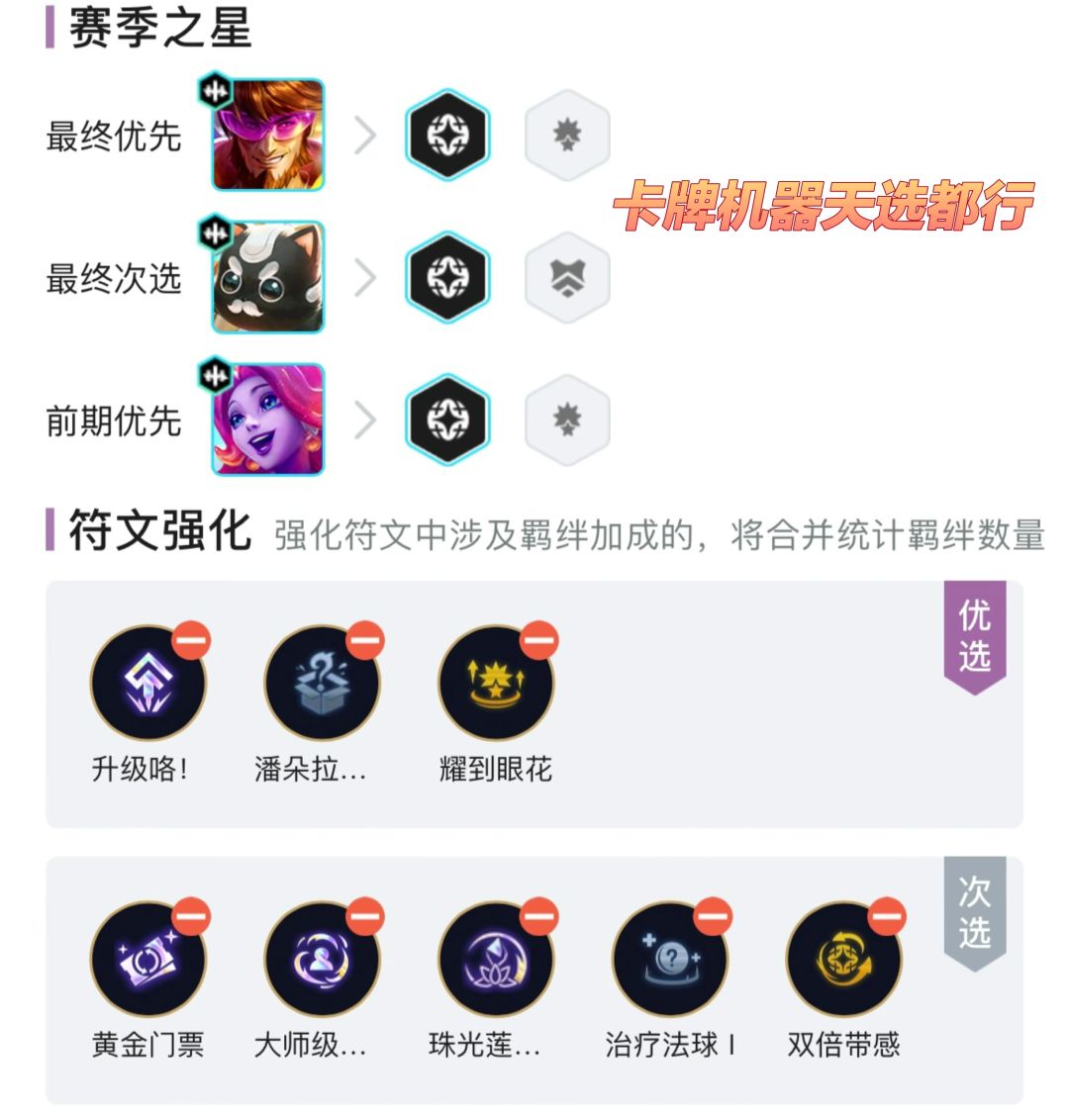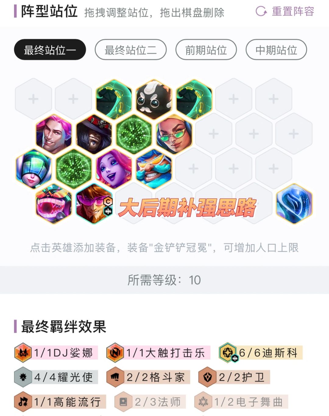 开局最理想的状态是迪斯科天选娜美或者宝石,三迪斯科拼多多过渡,搭配斗士护卫耀光使等等。