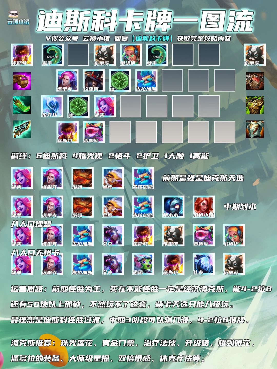 [偷笑R]今天给大家推荐一套新赛季当前T0运营阵容--迪斯科卡牌,只要成型必前四,能上九基本都能吃鸡或者前二。