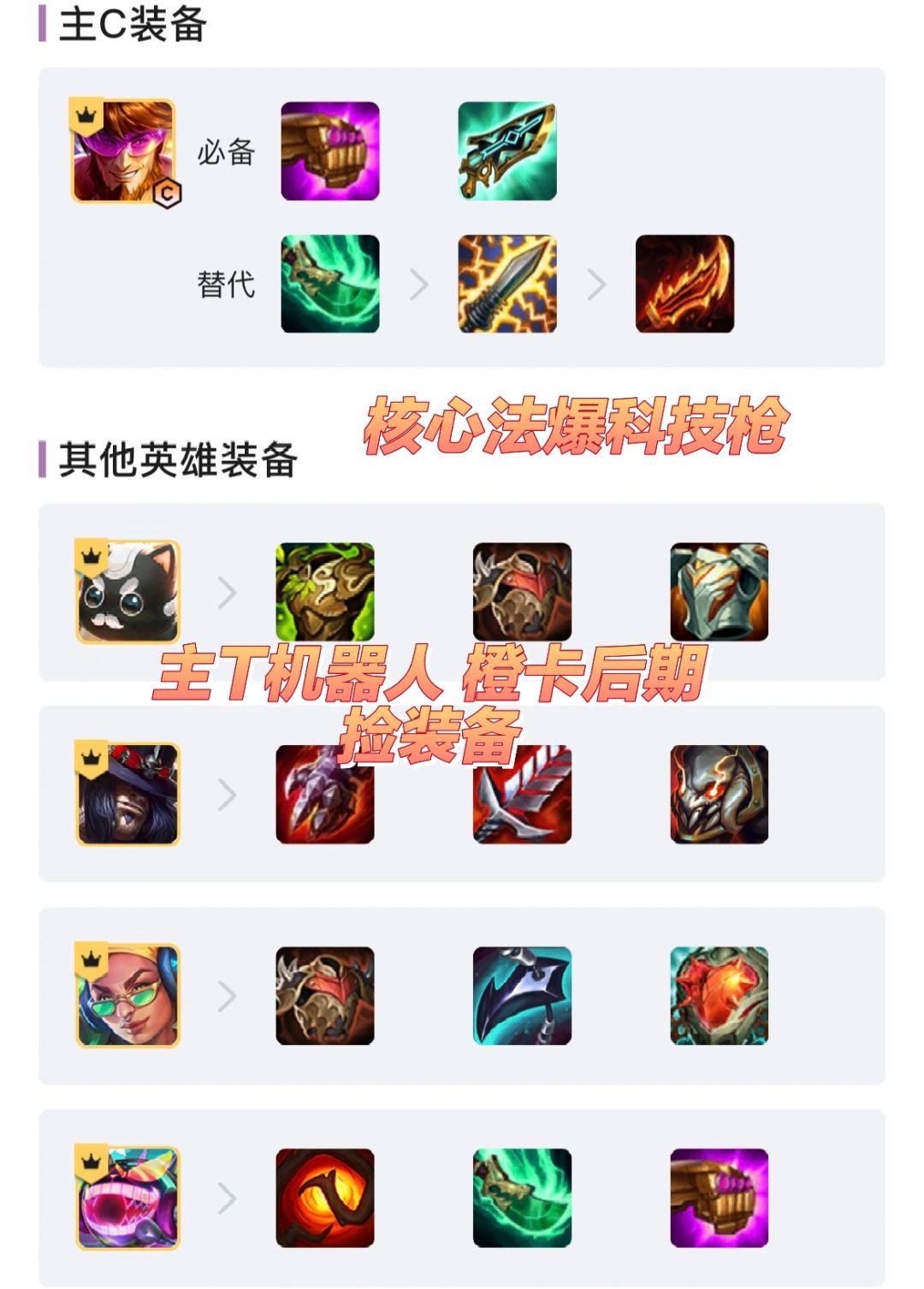 装备思路:小猪试了很多把,法爆和科技枪是最优先的,第三件青龙刀的输出效率是高于羊刀的,电刀的好处在于前中期过渡很舒服,但是炸弹人来了之后等于弱化了,上限低了点也可以用。