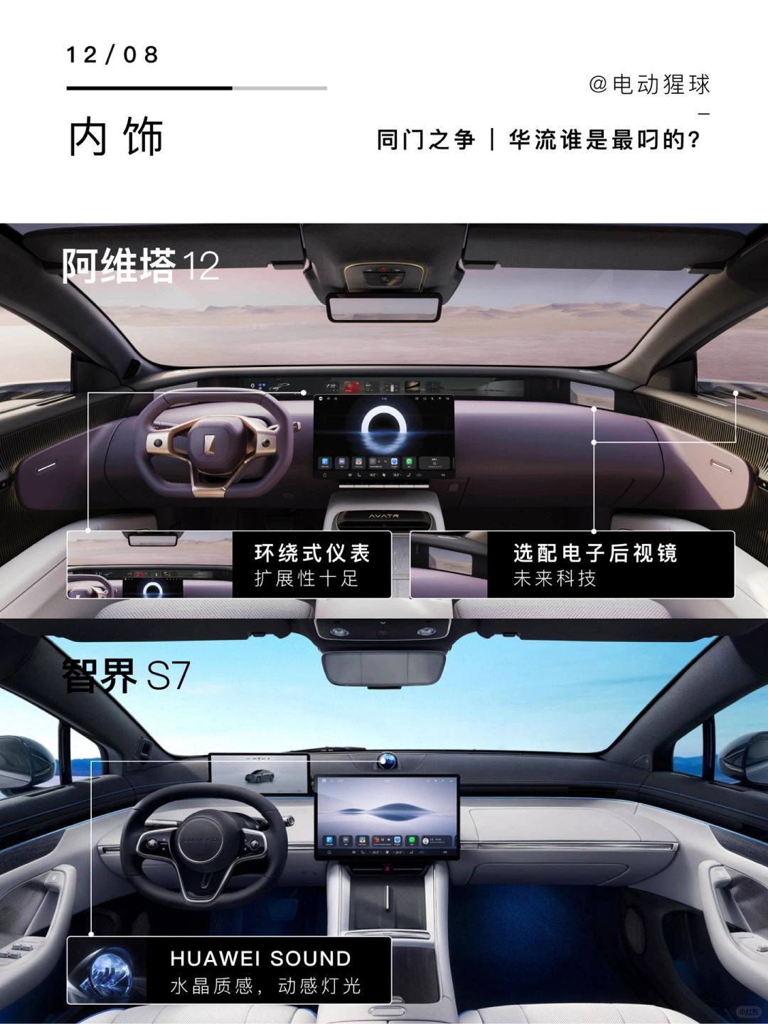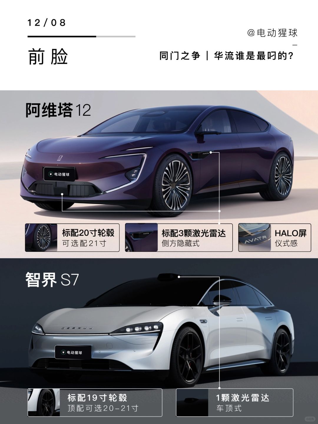 颜值方面仁者见仁,喜欢个性外观的选阿维塔12,车身姿态和内饰细节完美,审美比较求稳的选智界S7