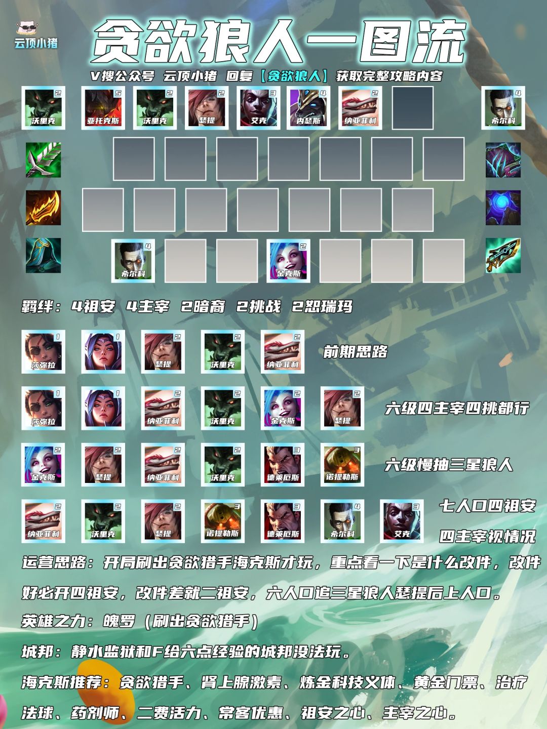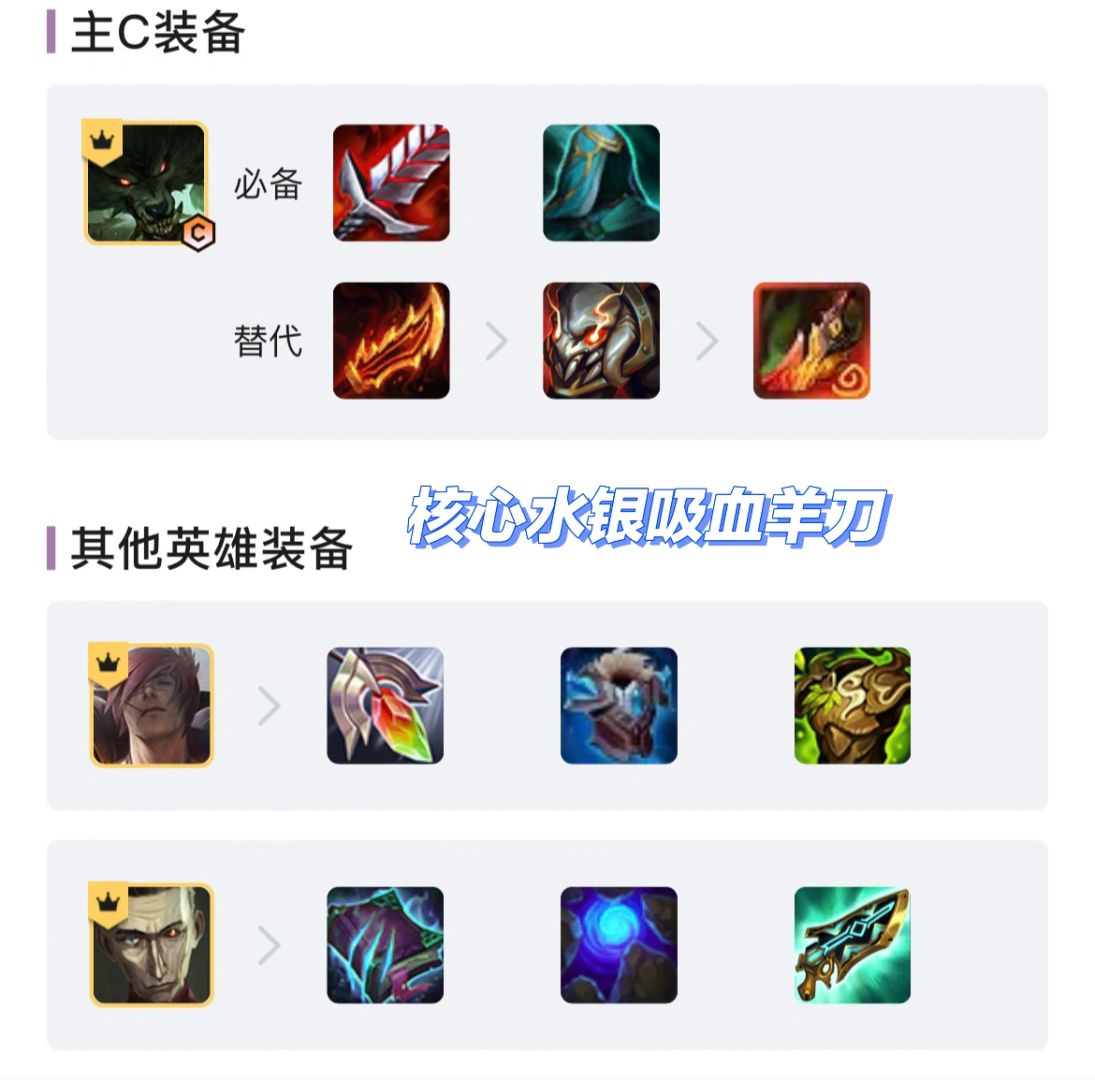 装备思路:狼人只要不是外骨骼改件,必备水银和一个吸血装、羊刀,装备卡的比较死,副位希尔科或者三星金克丝这个看你装备和牌的情况,瑟提一起追三给个救赎和冰甲就行了。