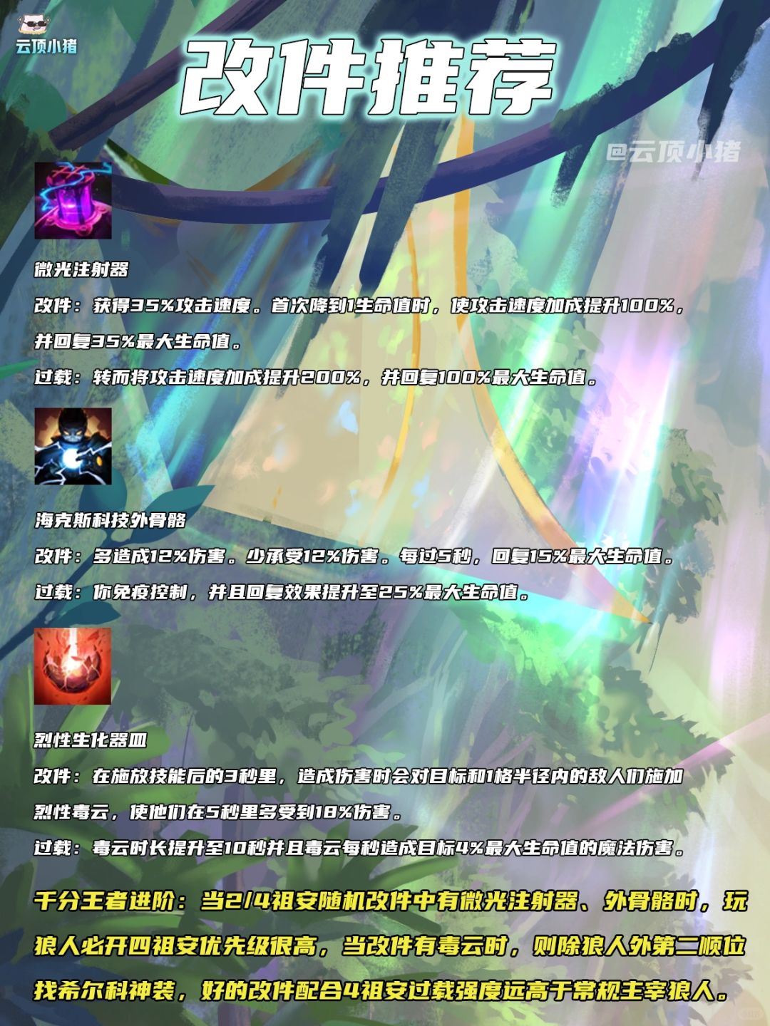 根据有无主宰之心、祖安之心可灵活变阵,最关键的是随机改件是什么,直接影响狼人强度,这个版本只要不是很差的改件四祖安都要开,过载太关键了。