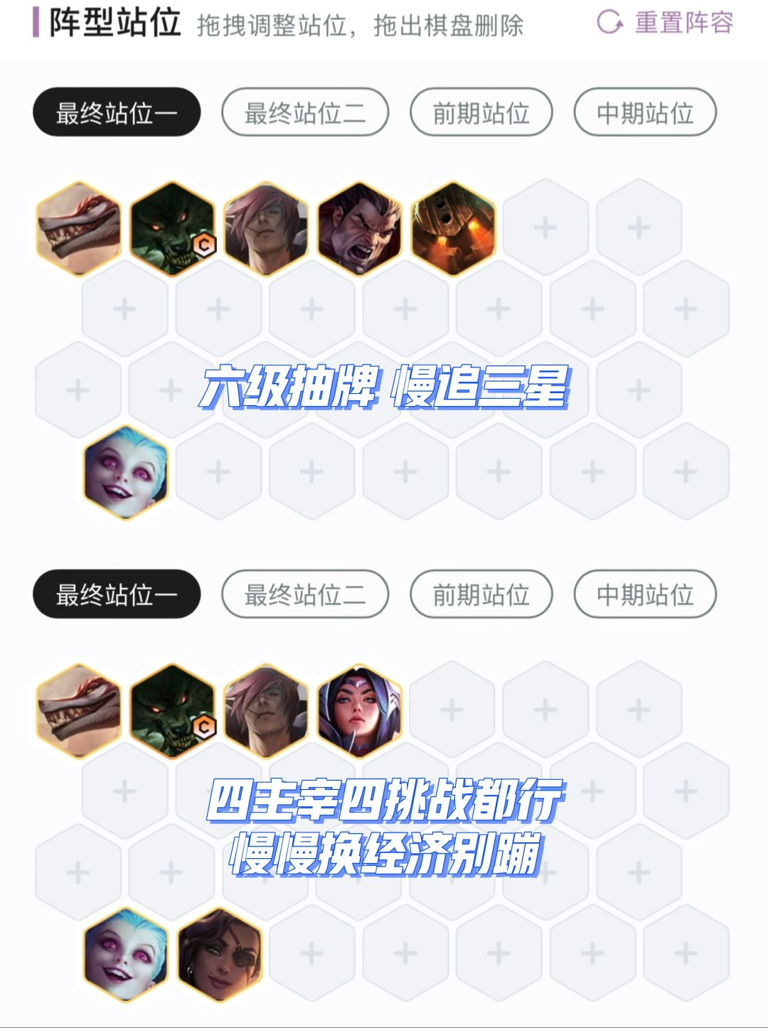 六人口开始抽牌,慢慢D就好,搭配四挑战四主宰都OK,狼人二星之后其他牌质量大差不多就卡40-50利息D,最好是在四阶段抽出三星狼,然后五阶段才能拉八开出合理的羁绊。
