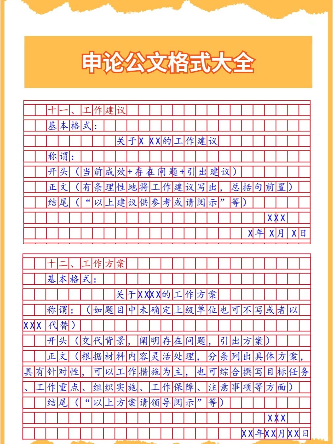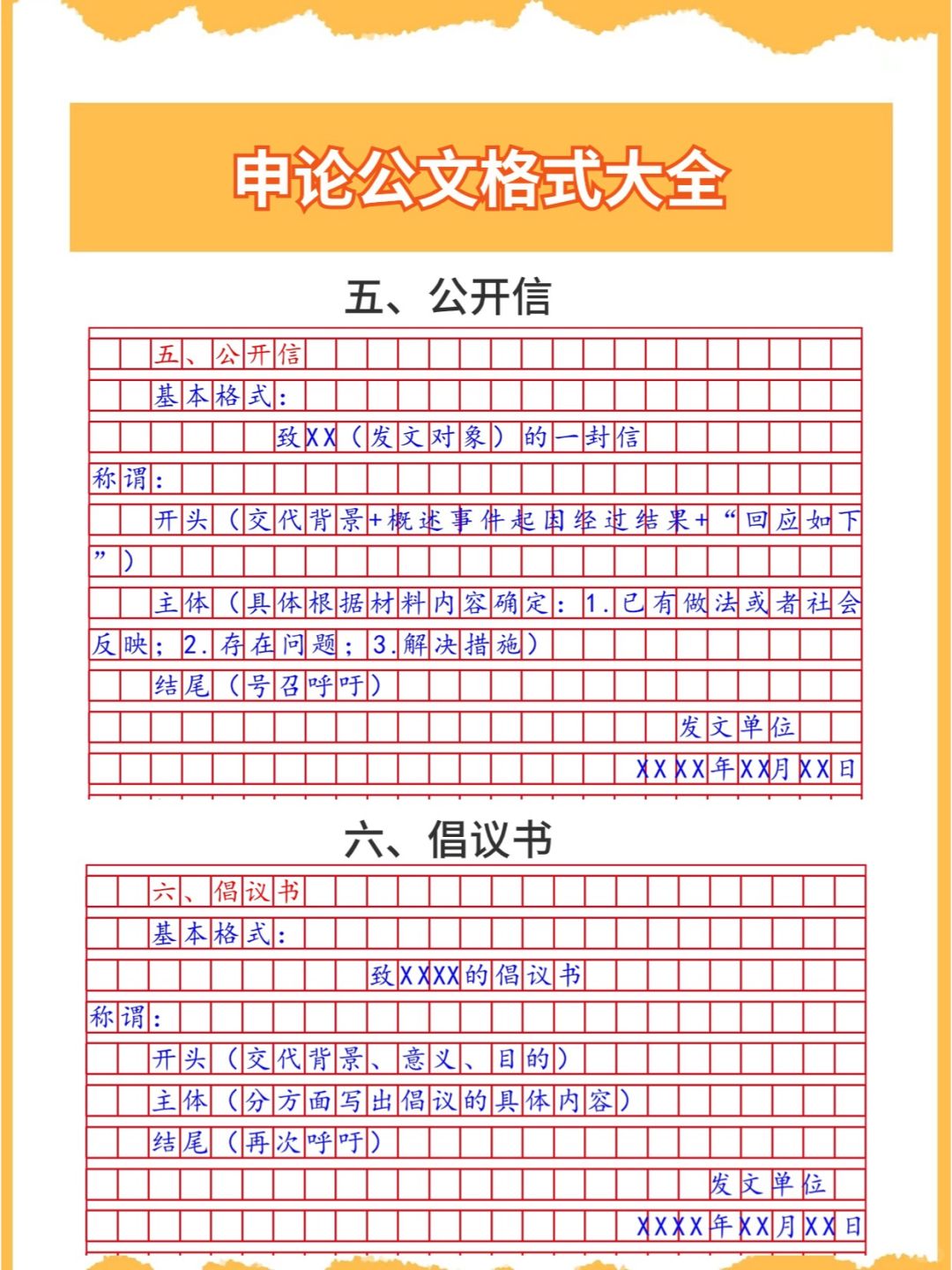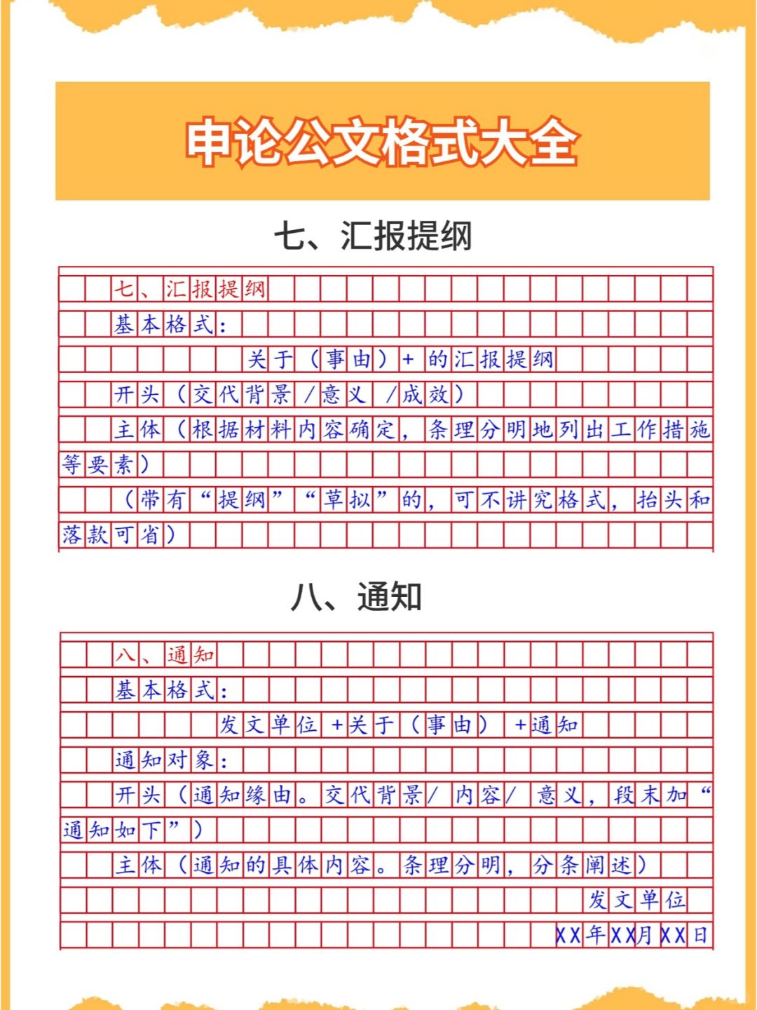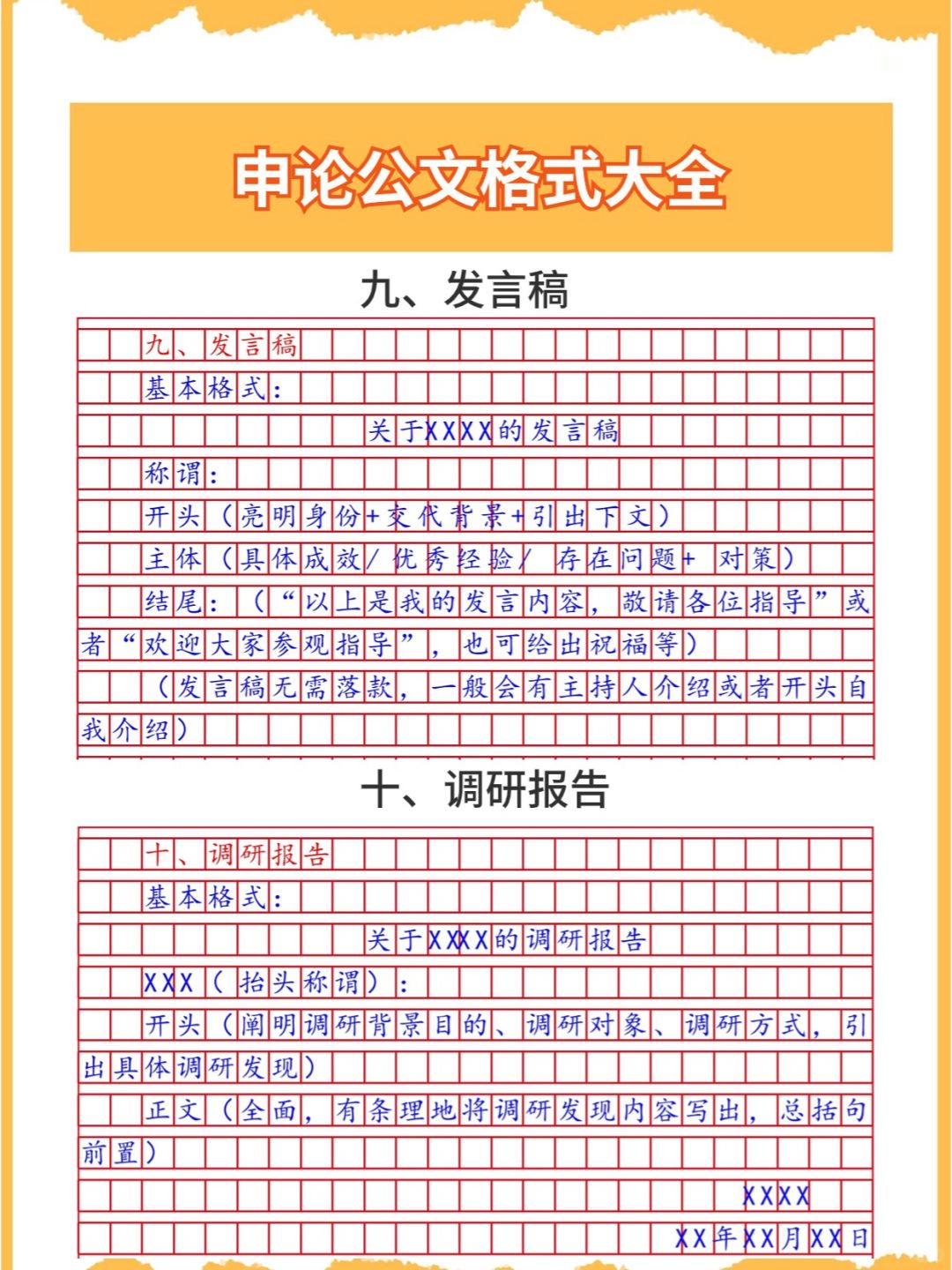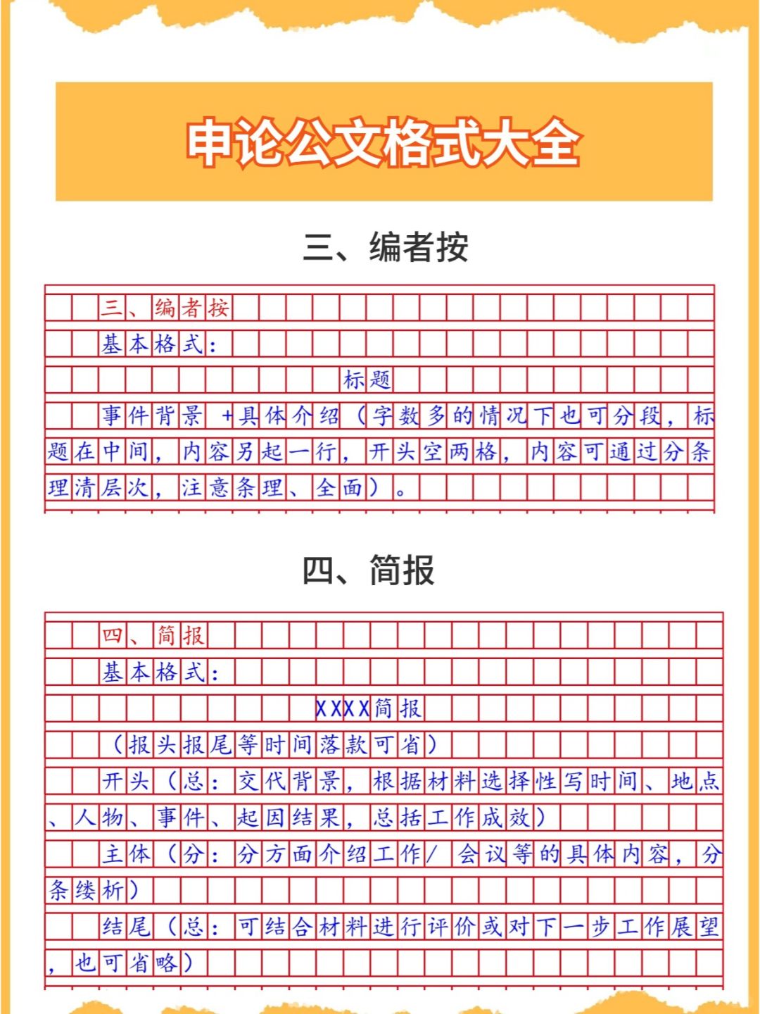 省考笔试倒计时~12种常见公文格式+范例,考前再熟悉熟悉。 一、宣传稿 二、短评 三、编者按 四、简报 五、公开信 六、倡议书 七、汇报提纲 八、通知 九、发言稿 十、调研报告 十一、工作建议 十二、工作方案 ......