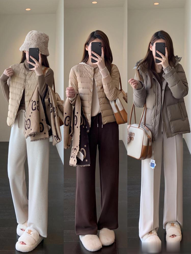 棉服马甲叠穿也实用。里面配个修身针织衫,下面搭条奶白色阔腿裤。马甲别太短,微微有点廓形能修饰比例。这一身下乡或者通勤,感觉挺亲切的。
