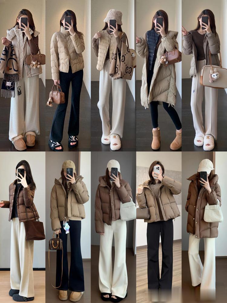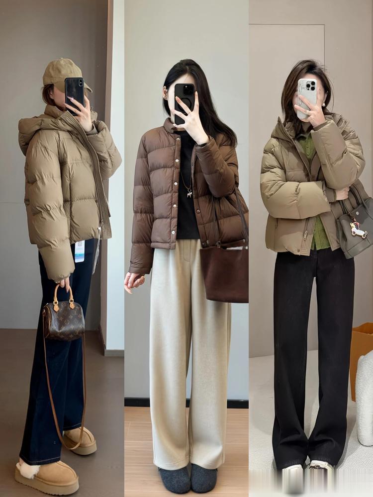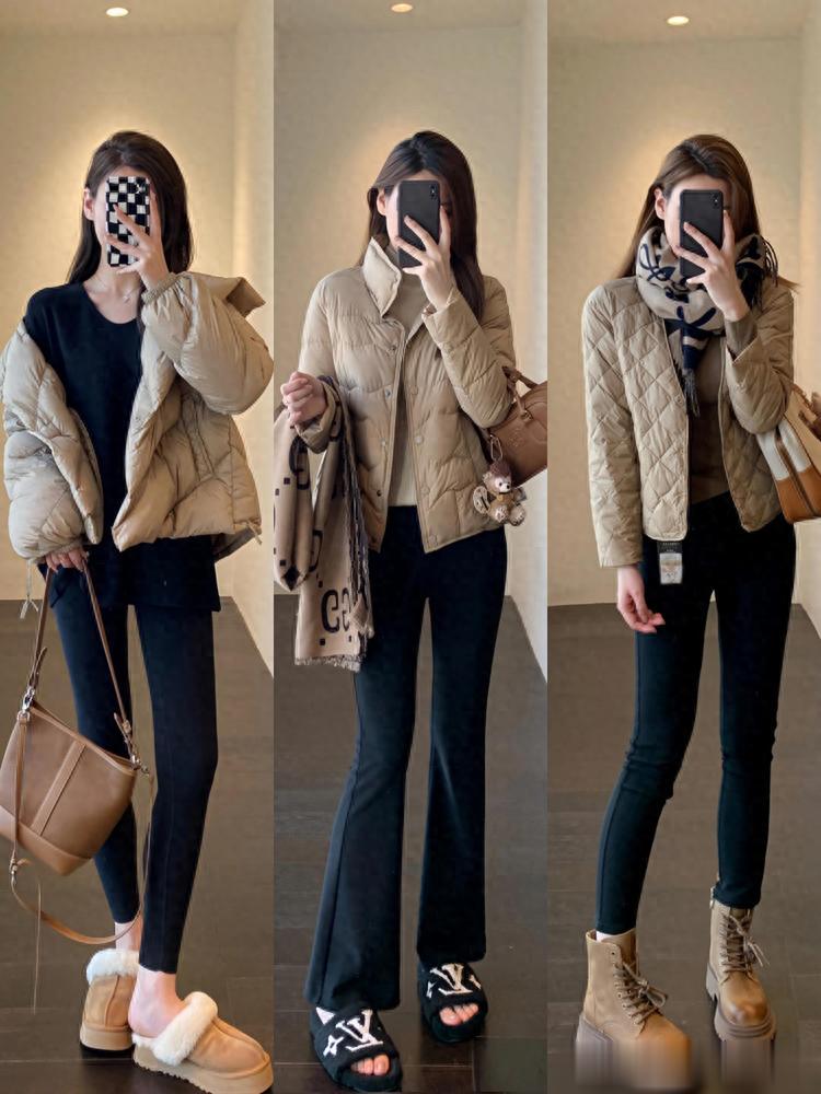 短款羽绒配直筒裤是经典组合。选哑光菱格纹的羽绒服不容易显胖。裤子要垂坠感好的,稍微堆在鞋面上有点随意感。再踩双棕色乐福鞋,上班开会都挺精神。