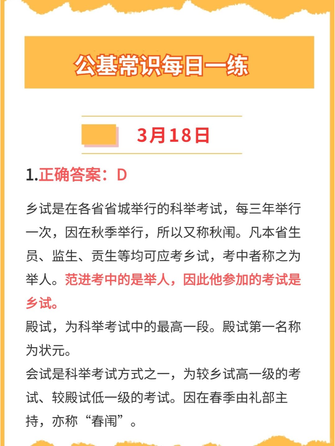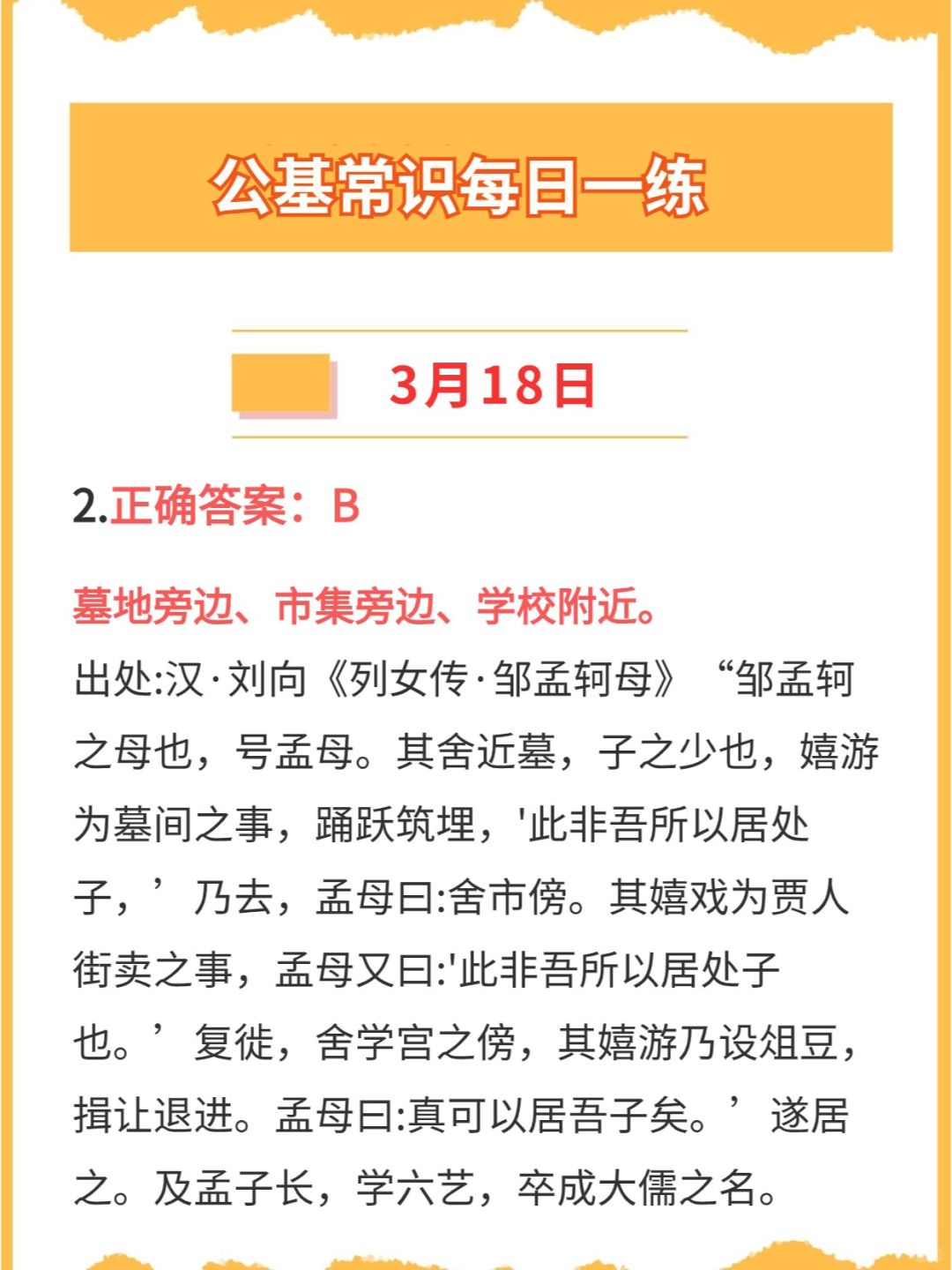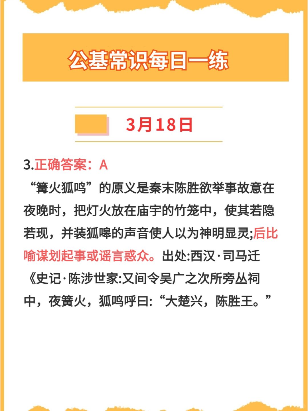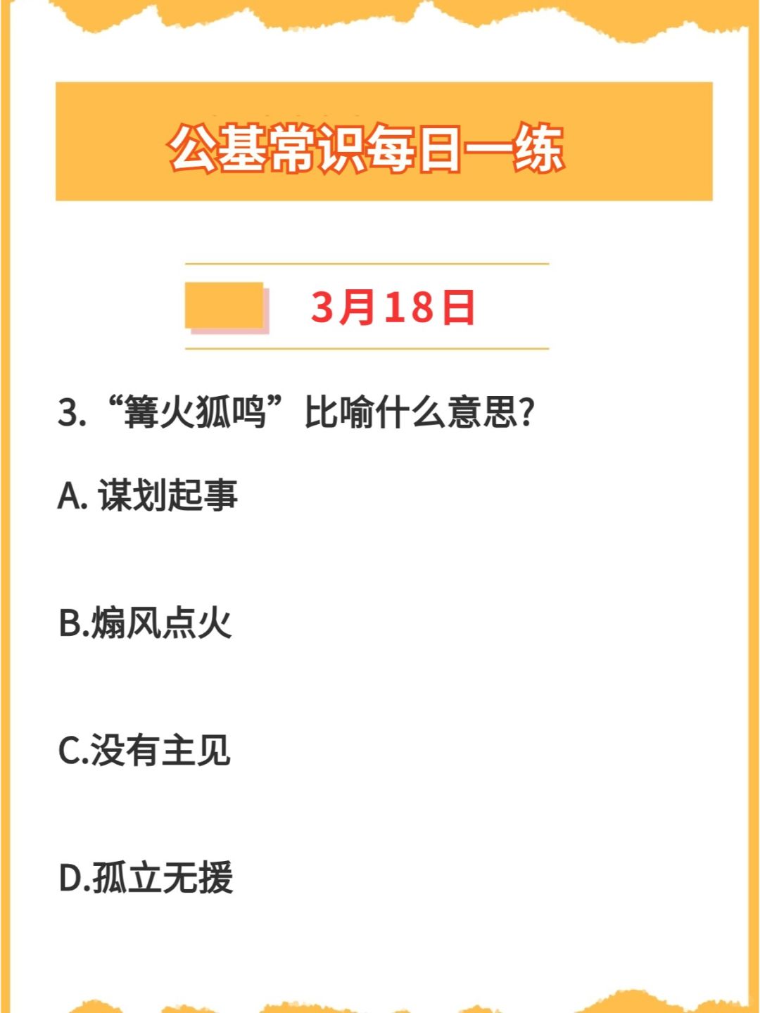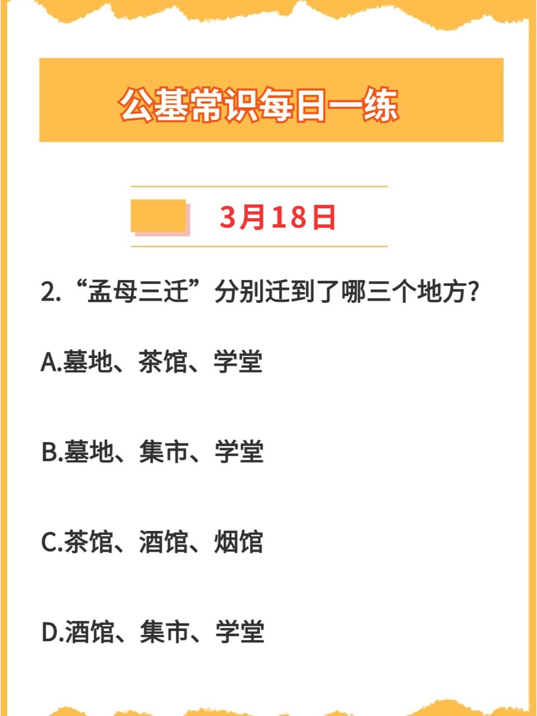 “孟母三迁”分别迁到了哪三个地方? A.墓地、茶馆、学堂 B.墓地、集市、学堂 C.茶馆、酒馆、烟馆 D.酒馆、集市、学堂 “范进中举”中范进参加的是什么考试 A. 殿试 B. 会试 C. 院试 D.乡试 “篝火狐鸣”比喻什么意思? A. 谋划起事 B.煽风点火 C.没有主见 D.孤立无援