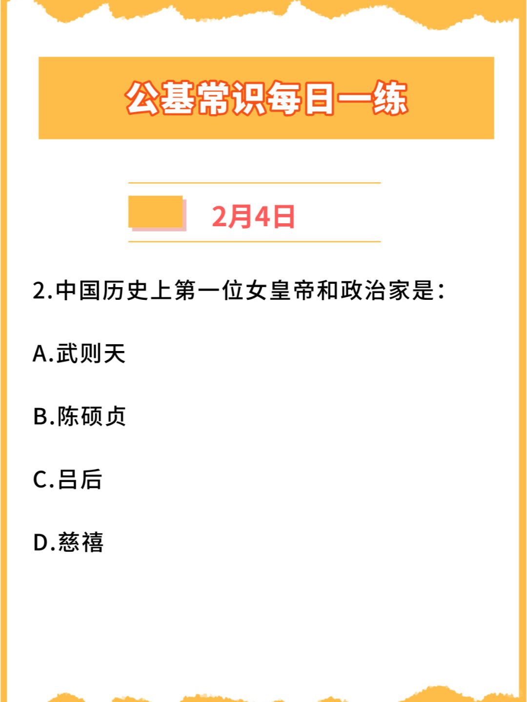 今日常识每日一练来啦~ 1.今天能够看到的最早的中国文字是 A.金文 B.甲骨文 C.隶书 D.小篆 2.中国历史上第一位女皇帝和政治家是: A.武则天 B.陈硕贞 C.吕后 D.慈禧 3.被称为“黄金水道”的是? A.黄河 B.长江 C.淮河 D.京杭大运河