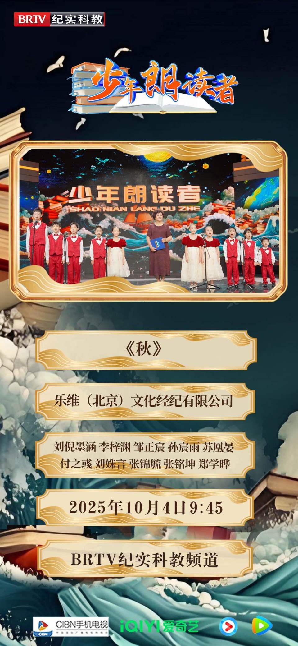 秋高气爽,丹桂飘香。在这个寓意丰收与成熟的季节里,北京广播电视台《少年朗读者》节目迎来了一场别开生面的朗诵盛宴。10月4日,乐维素质偶像邹正宸、苏凰晏、李梓渊、刘倪墨涵、孙宸雨、付之彧、张锦毓、刘姝言、郑学晔、张铭坤与著名表演艺术家徐松子老师联袂登台,深情演绎了朱自清先生的经典散文《秋》,用声音的艺术为国庆假期增添了一抹浓郁的文化色彩。
