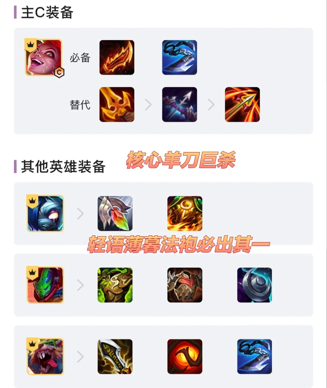 装备思路:金克斯常规装备最高胜率出装是羊刀杀人剑巨杀,前排潘森狂徒薄暮优先,实战中轻羽和薄暮必出一个,自己看情况灵活搭配。