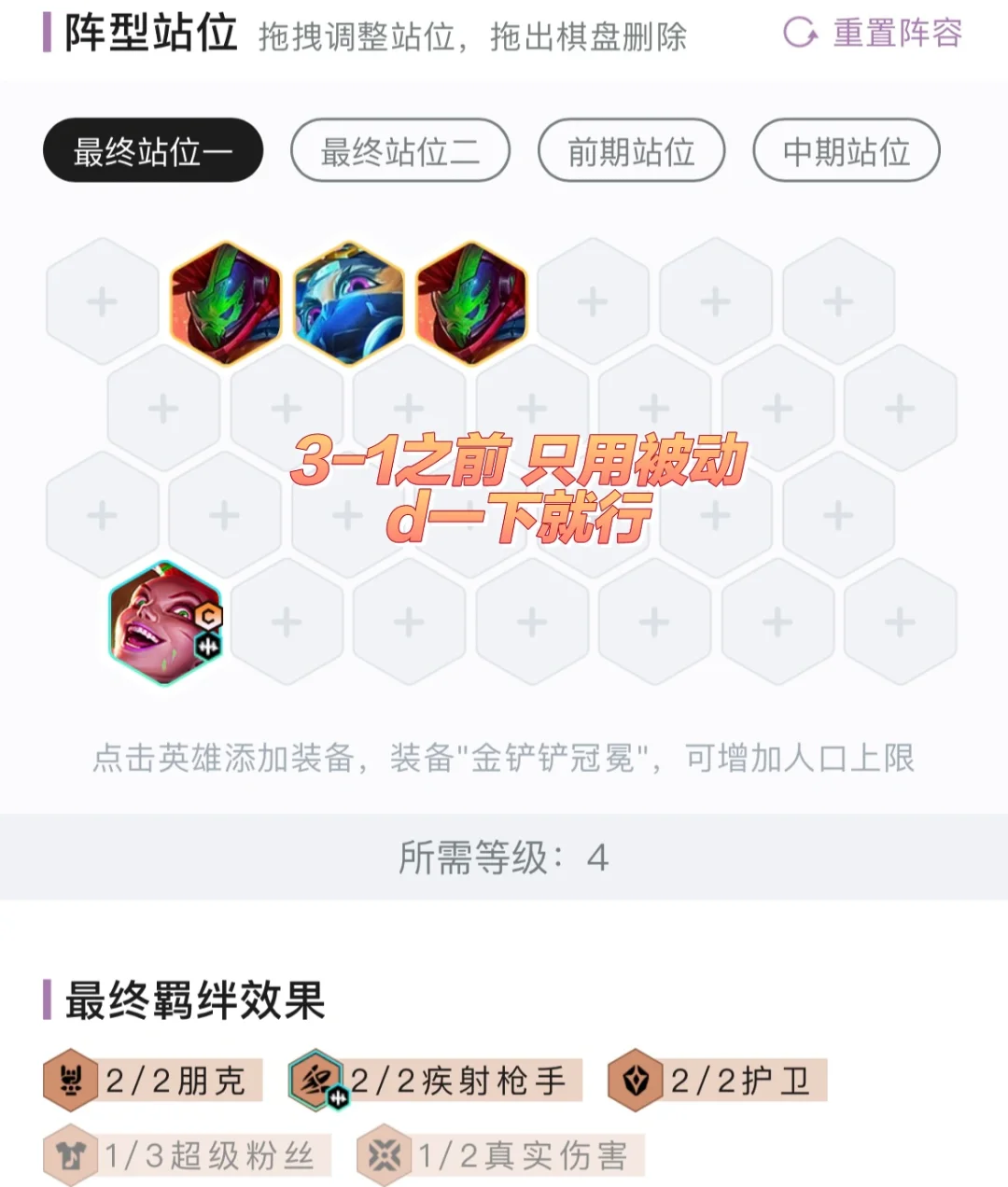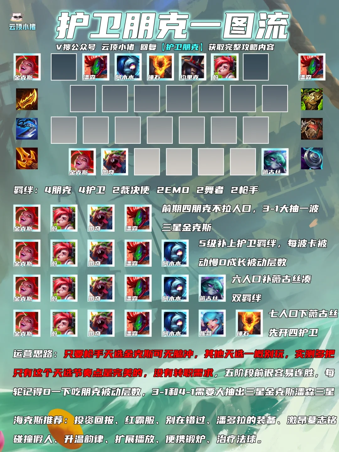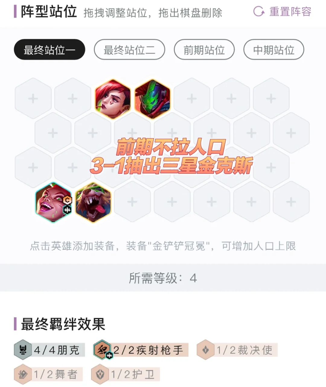 前期不拉人口,最好是四朋克,每回合用被动收益D一下就好,然后3-1需要大抽一波,因为有被动和天选的原因,3-1我们大概率是5-7张金克斯了,D到三星是基本要求也是基本操作。