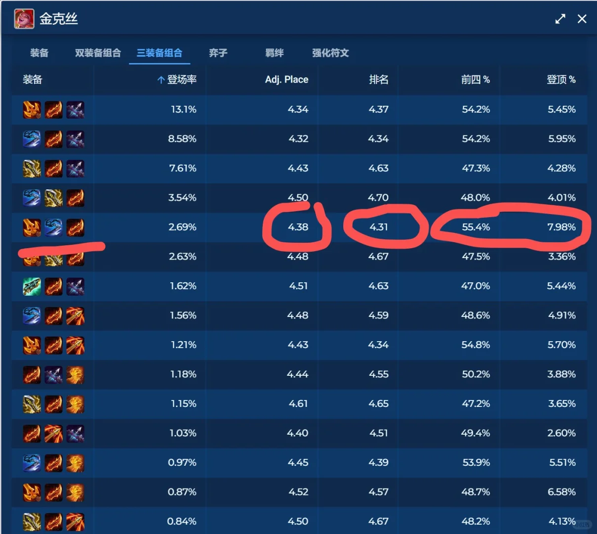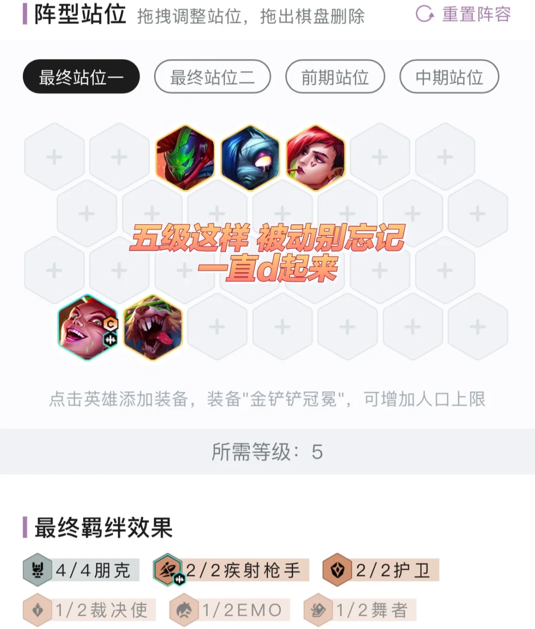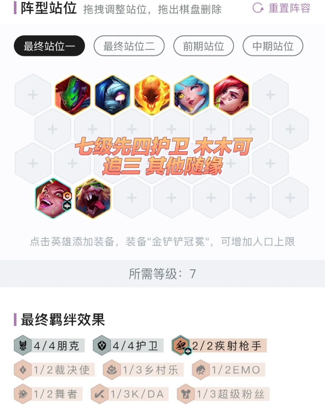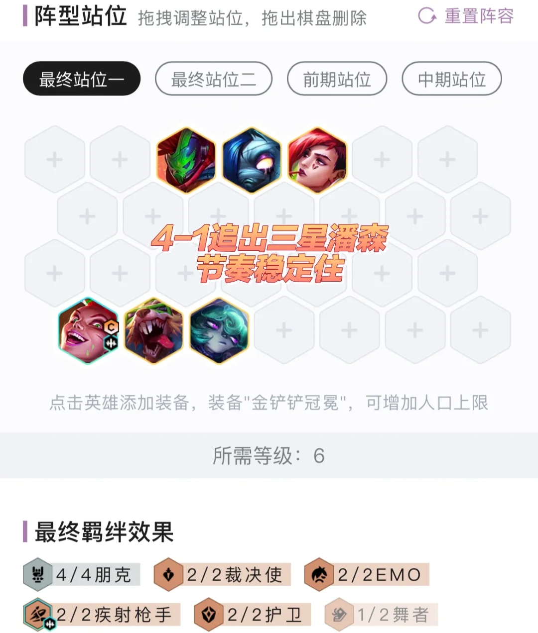 三阶段三星金克丝配上全二星的前排就随便连胜了,然后3-5左右拉6人口开两护卫两EMO两裁决,4-1或者4-2再大抽一波,至少追出三星潘森,老鼠和蔚能三就三,优先级潘森最高,潘森三星之后直接速8开出完美羁绊,节奏把握好基本必前三。