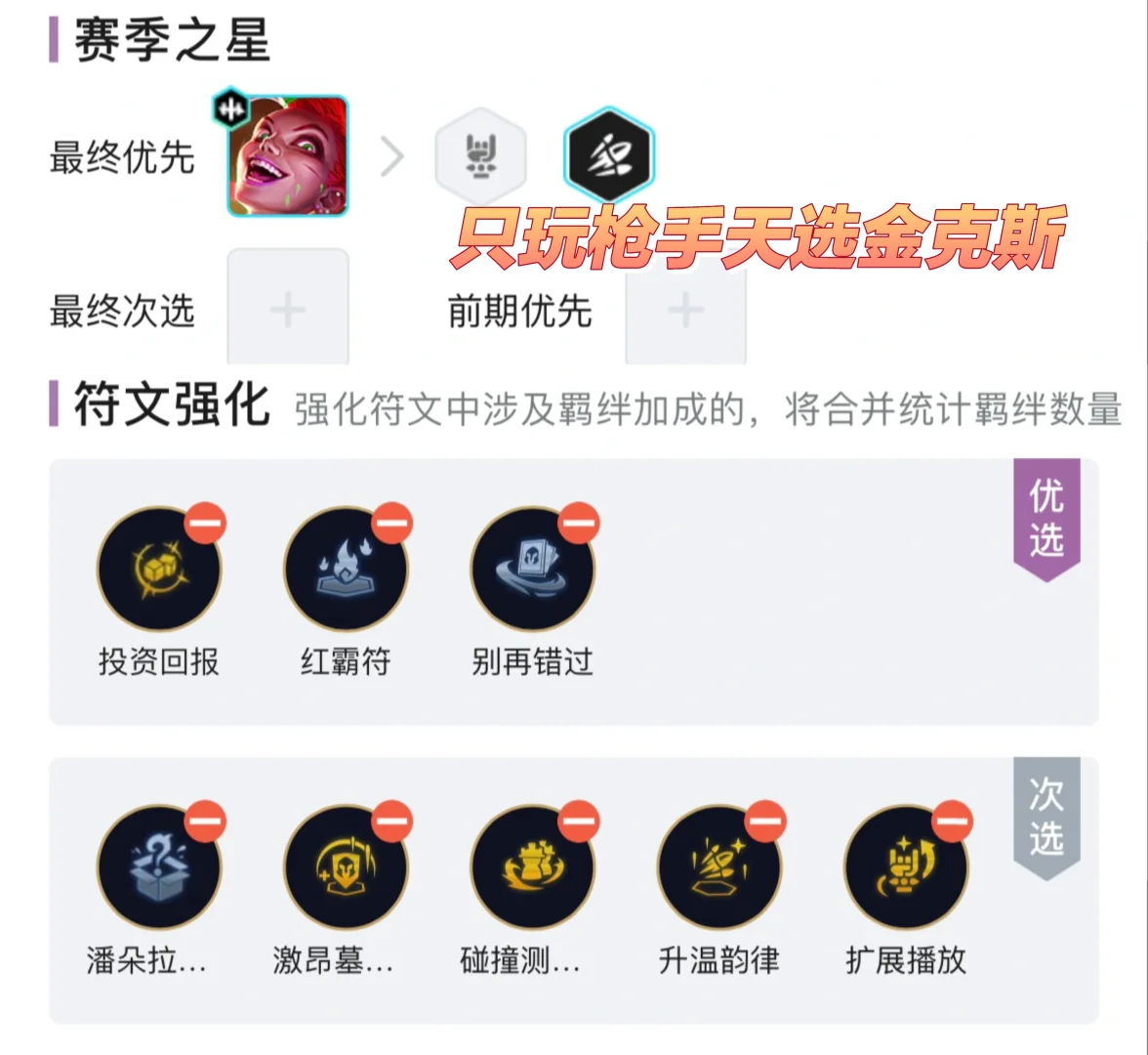 1、一定要金克斯枪手的天选,朋克的天选都差得多,因为牵扯到人口节奏点和前后排比例的问题就不细说了。