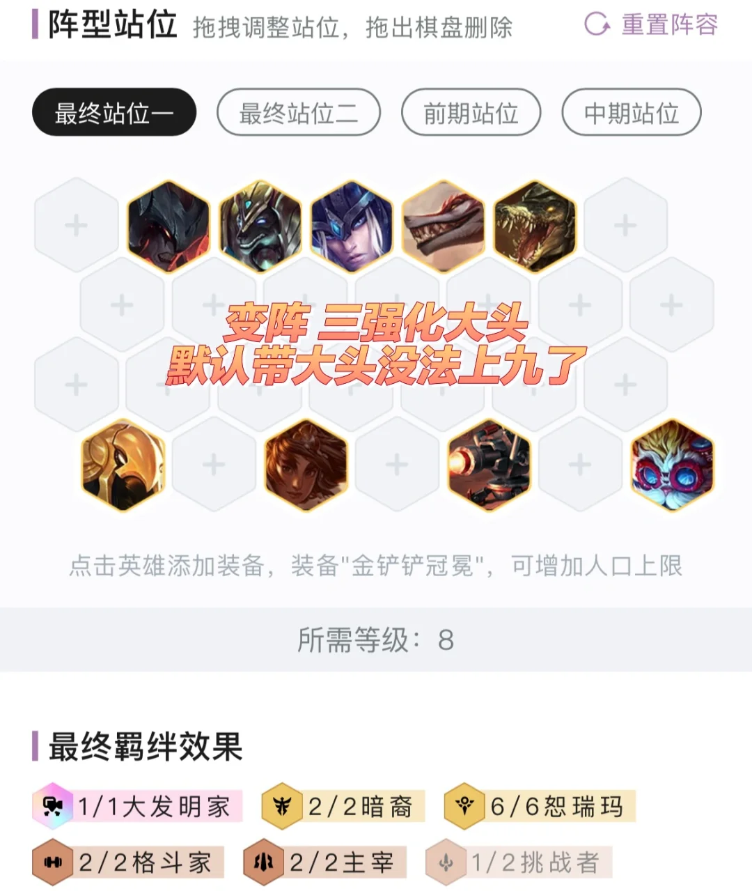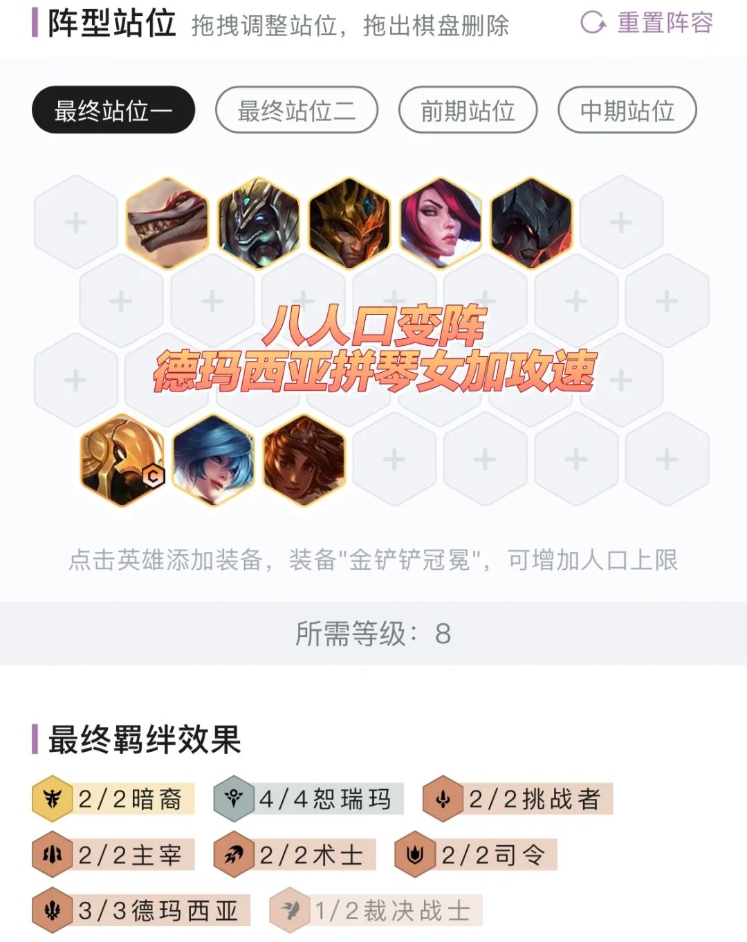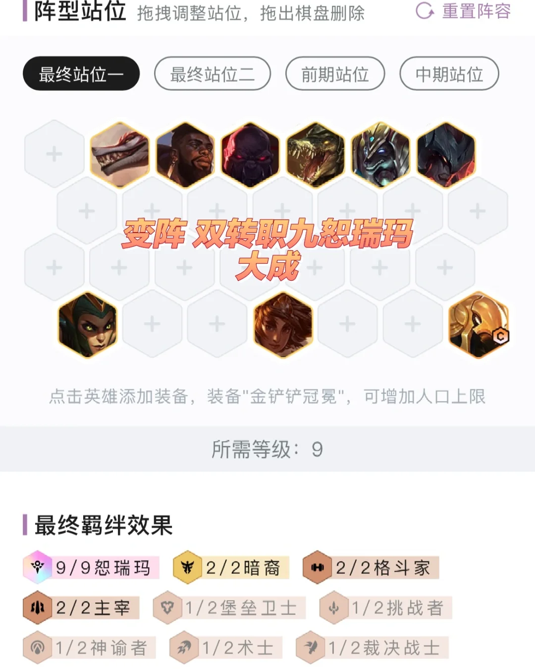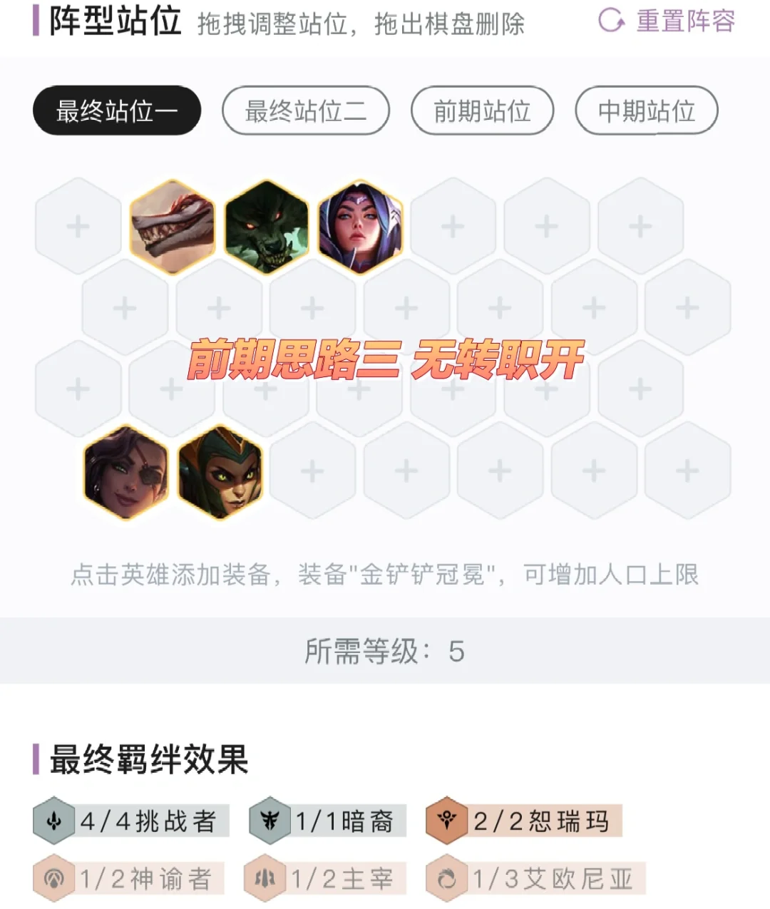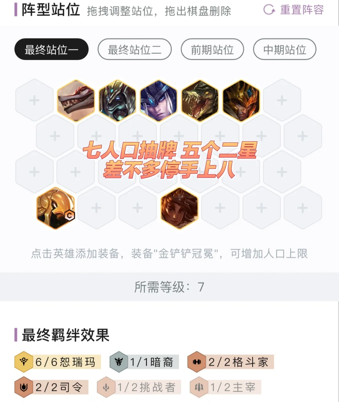 阵容七人口开始抽牌,抽出六恕瑞玛和整体质量五个二星左右考虑上人口找橙卡,如果自然之力双转职等可考虑在八人口打到第开出九恕瑞玛。