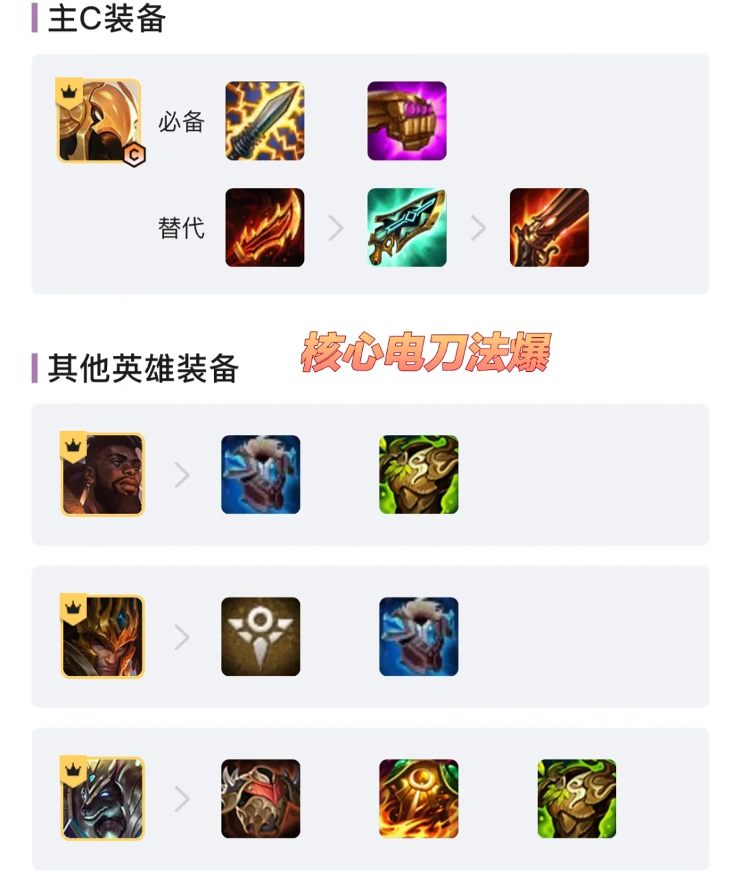 装备思路:优先做出电刀和法爆稳定伤害,高恕瑞玛羊刀第三件纳什也行,肉装全部给到狗头人,多余的给皇子/猪妹/黑哥。