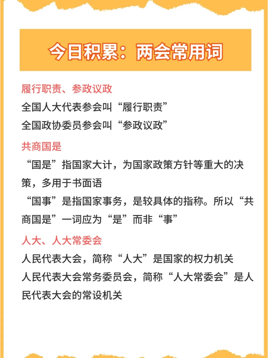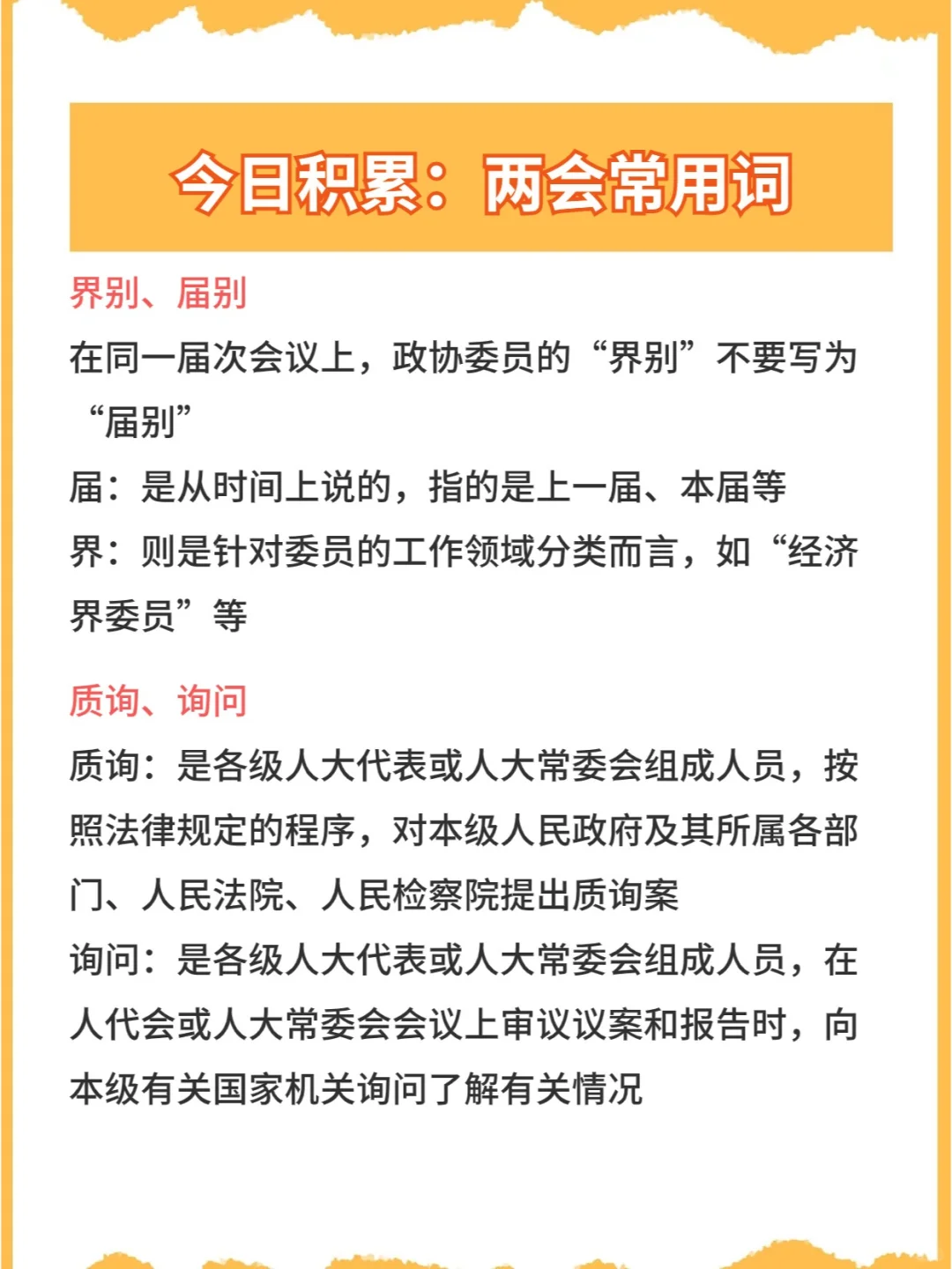 ✅届、次 人大是“x届全国人大x次会议” 政协是“全国政协x届x次会议” ✅代表、委员 出席人民代表大会的是代表,即人大代表出席政协会议的是委员,即政协委员 ✅议案、提案 全国人大代表提出的是“议案” 全国政协委员提出的是“提案” ✅审议、讨论 全国人大代表“审议”政府工作报告 全国政协委员“讨论”政府工作报告 代表、委员同时参加这一活动,可并称为“代表、委员审议讨论政府工作报告 省考备考进行时,加油备考呀