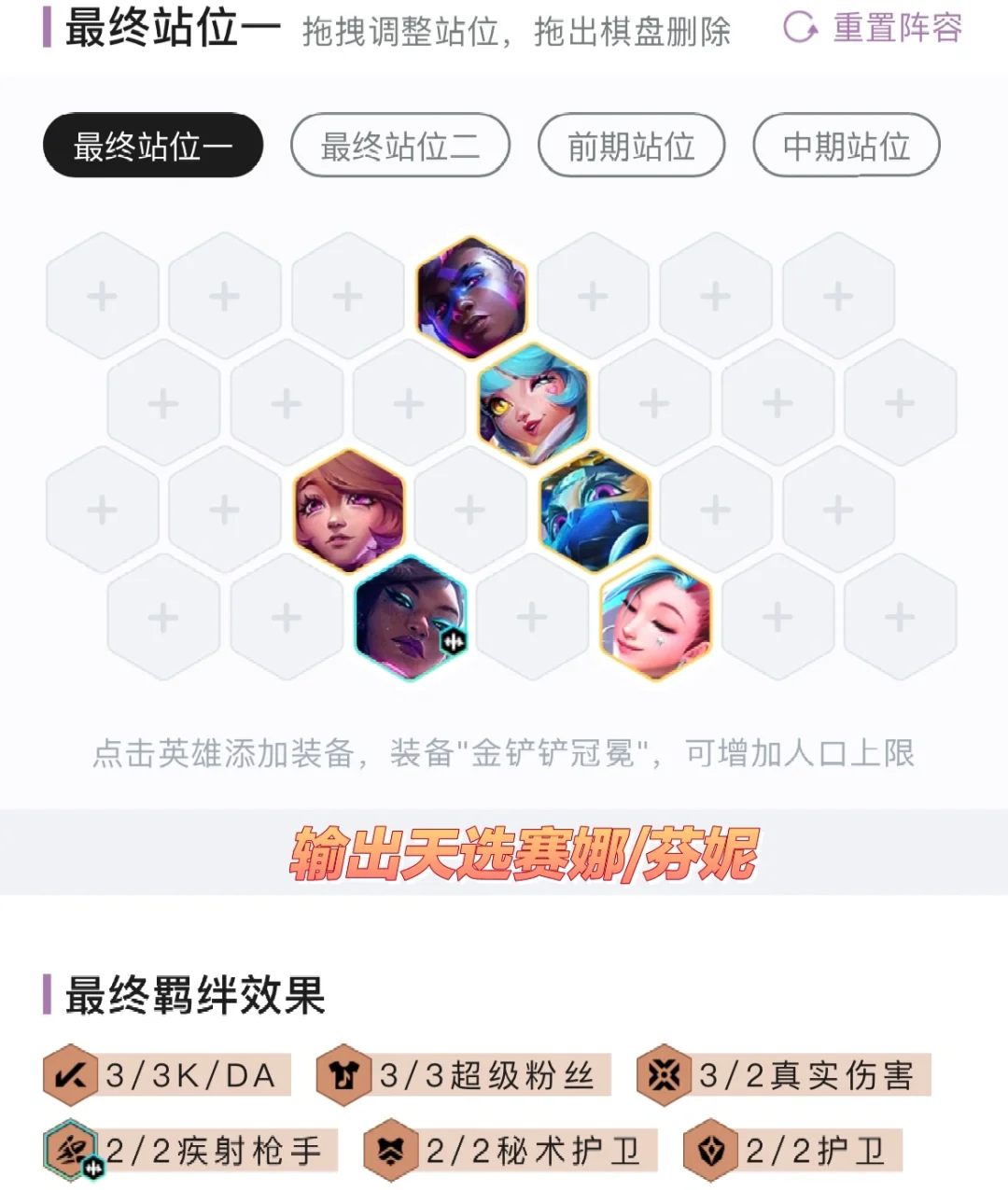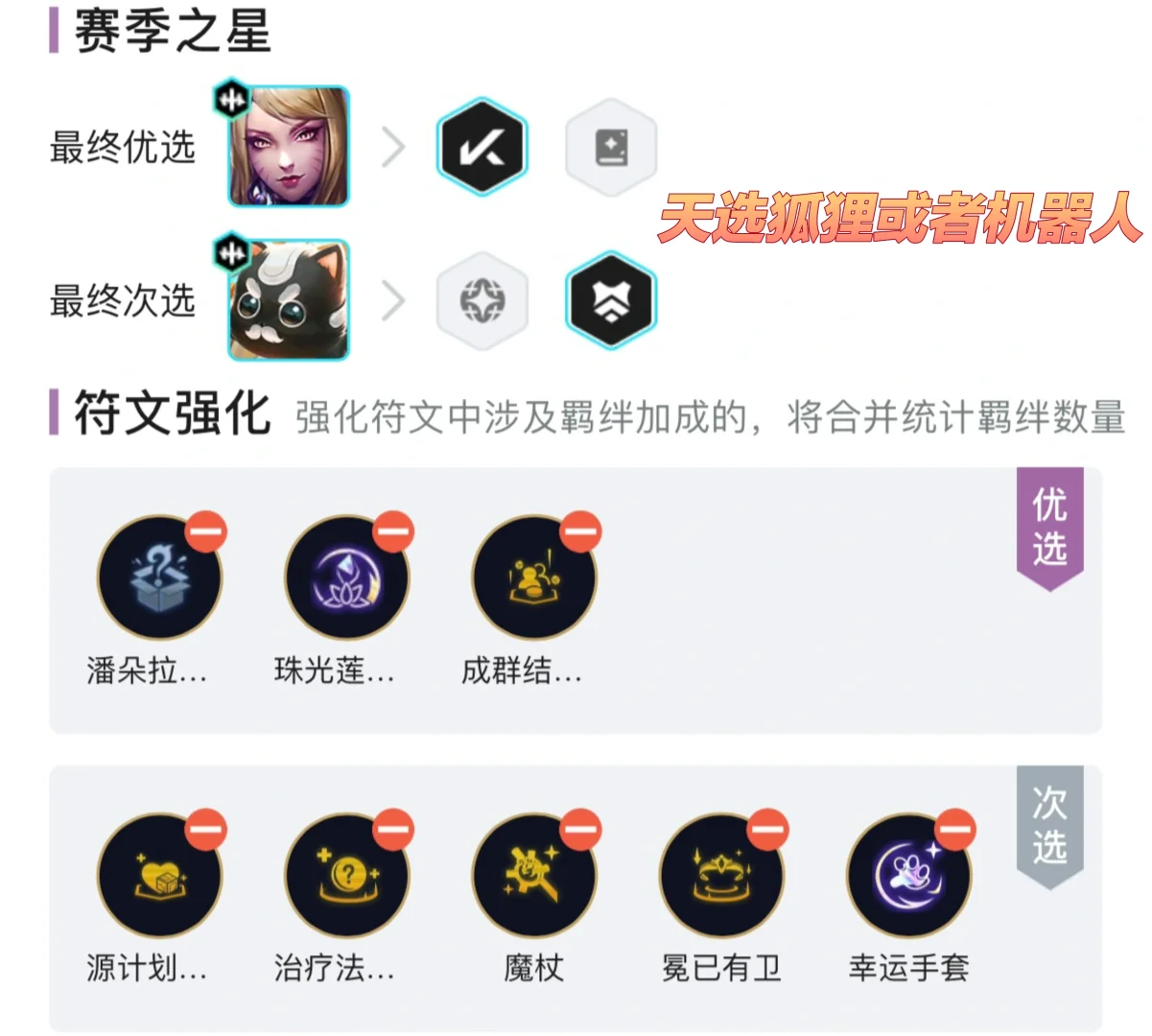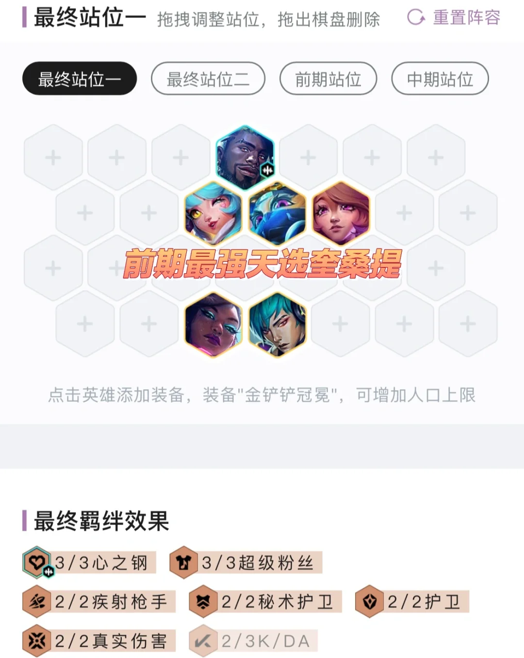 前期能连胜的情况下优先推荐连胜,前期最强的一费天选是奎桑提,不管是秘术还是心之钢,无脑拿,二费的天选就拿伤害的,卡特、赛娜、芬妮这些都行。