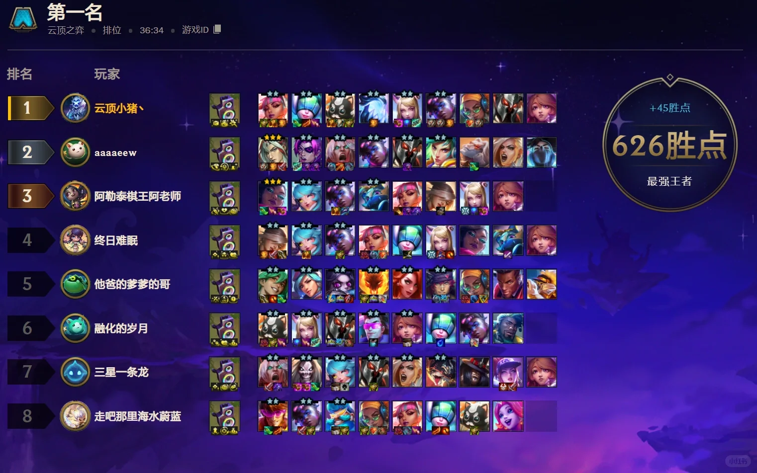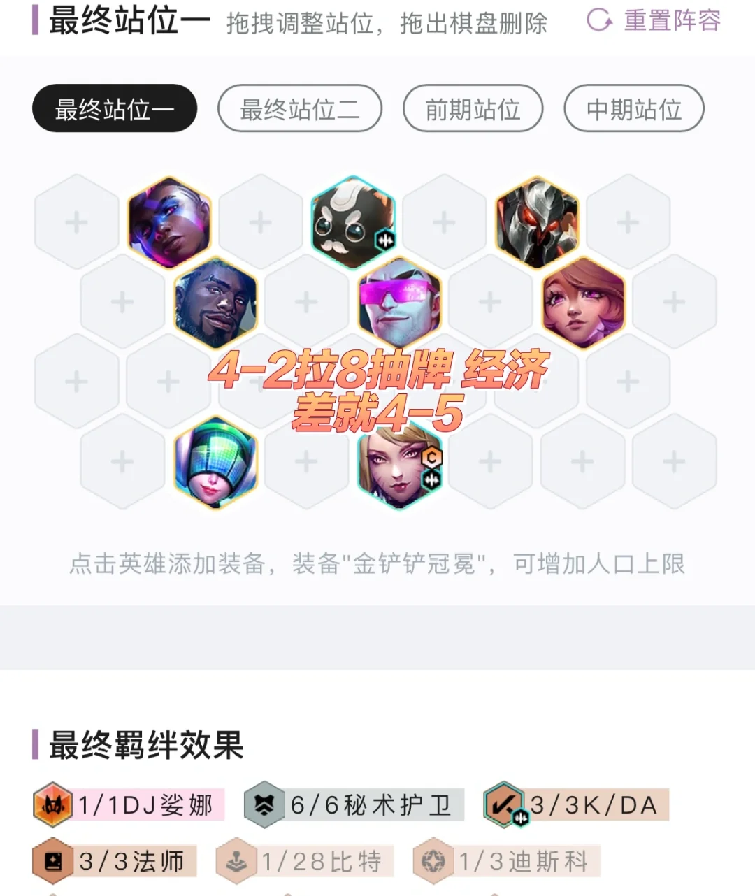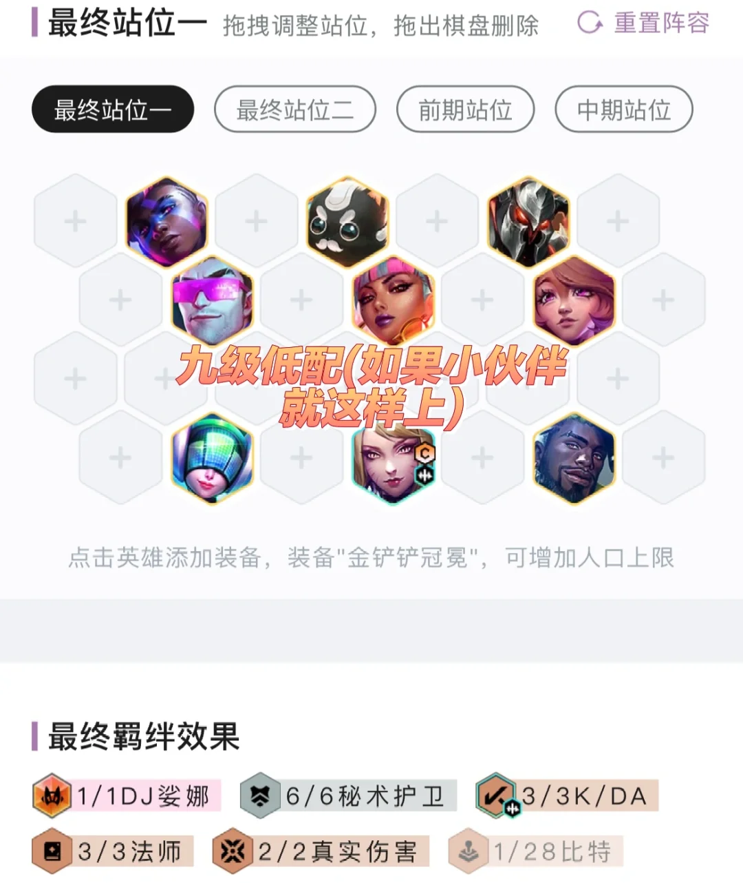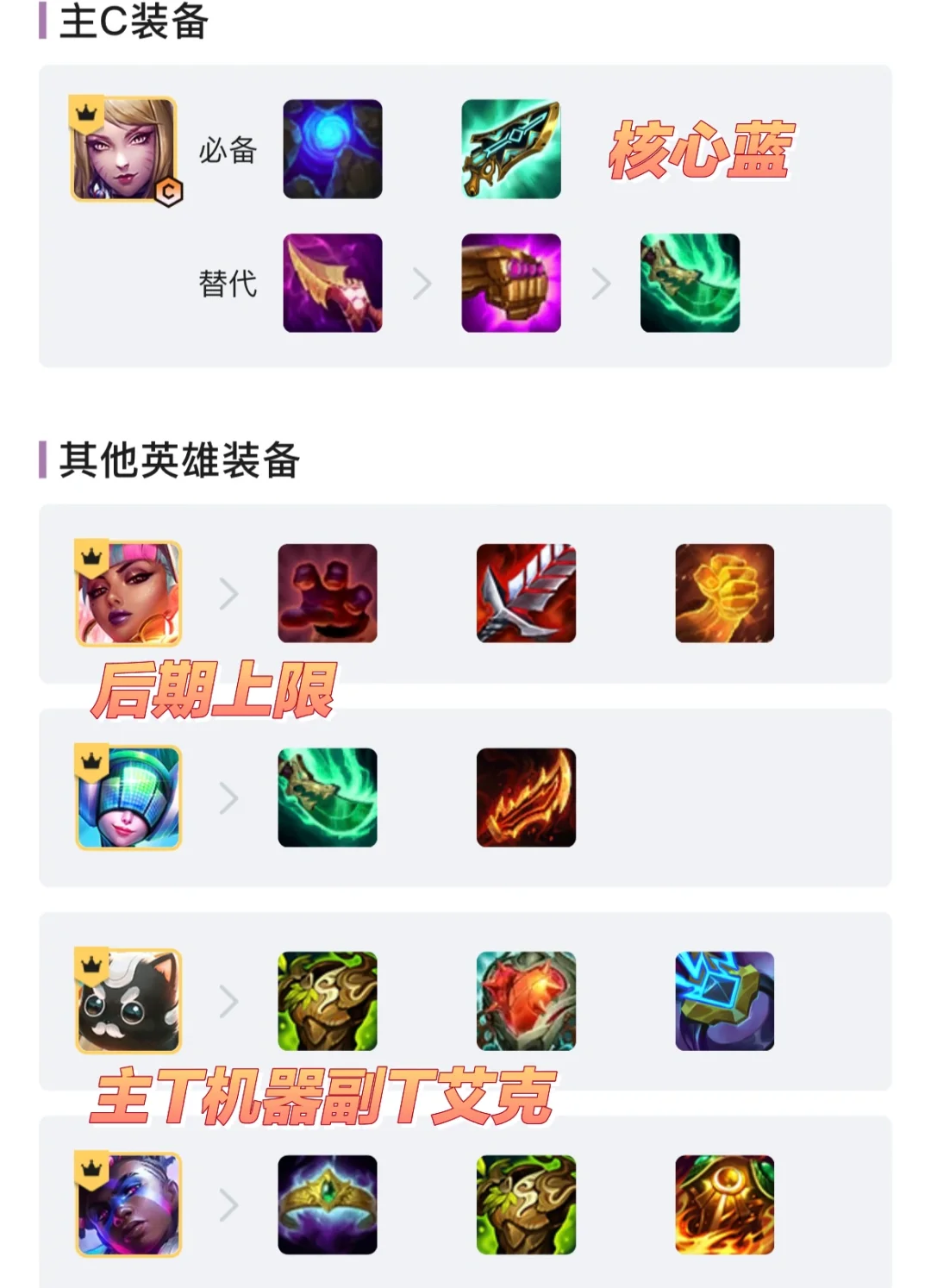1、装备符合度和经济是这个阵容最关键的地方,八级紫卡以及下全部二星就能吃分了,要登顶后期得有多张橙卡的。