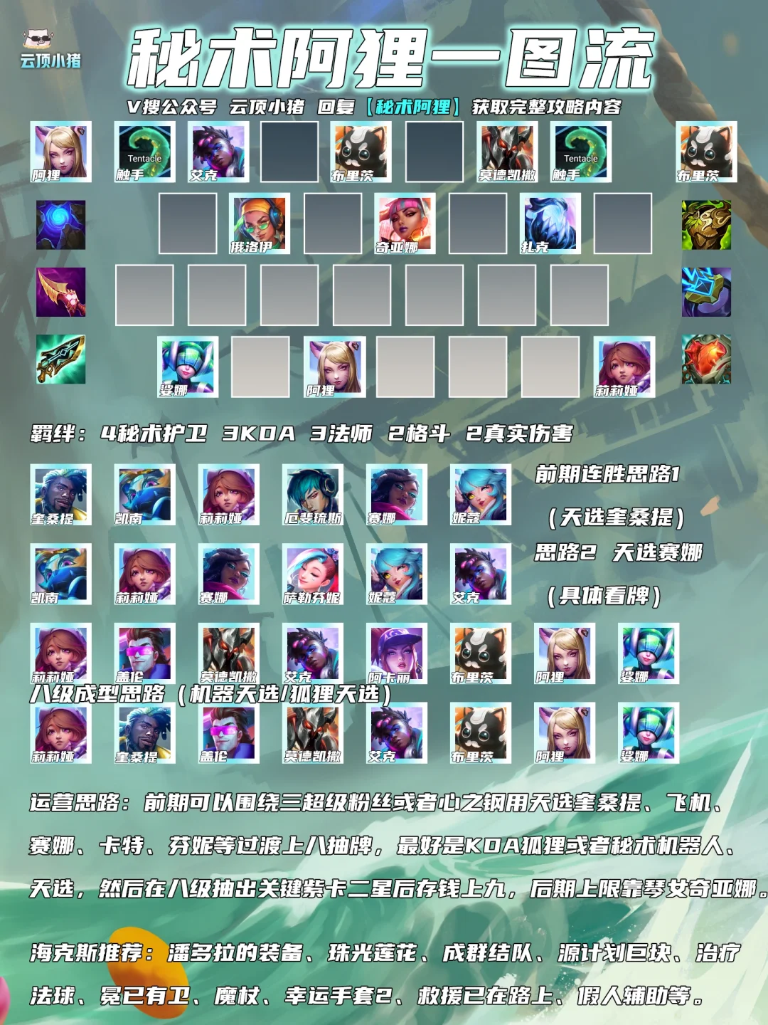 新年快乐!好久不见各位奕友们,今天就给大家分享一套当前版本比较稳定且高频率的上分阵容秘术阿狸转九五的玩法,在云顶和金铲铲王者局均可冲。