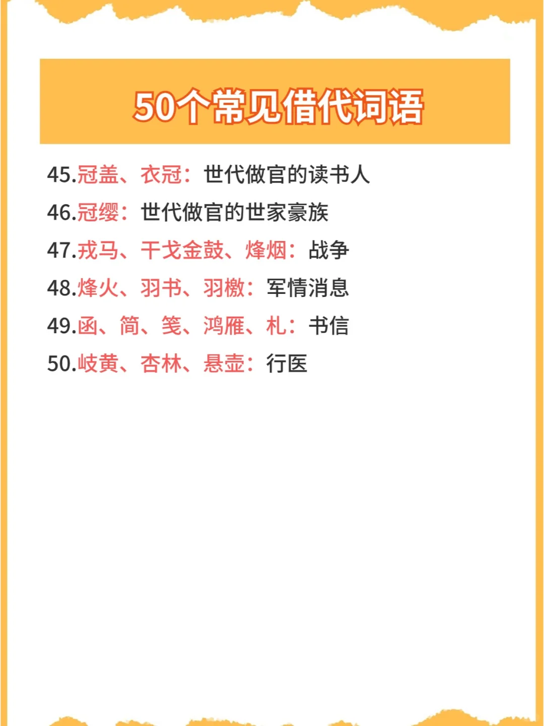 今日学习打卡:50个常见古文借代词 1.桑梓:家乡 2.桃李:学生 3.南冠:四犯 4.同窗:同学 5.烽烟:战争 6.巾帼:妇女 7.丝竹:音乐 8.须眉:男子 9.手足:兄弟 10.汗青:史册 11.伉俪:夫妻 12.桑麻:农事 13.三尺:法律 14.膝下:幼年 15.华盖:运气