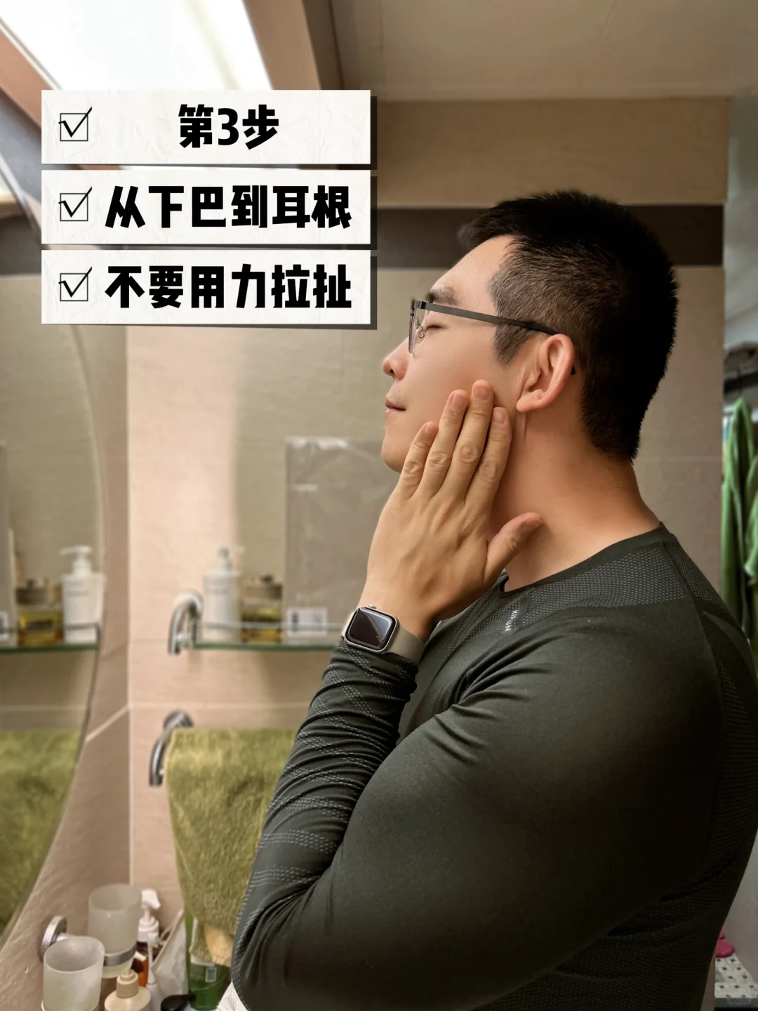 3. 沿着下巴到双耳的方向轻轻涂抹,一定要避免过度拉扯皮肤。