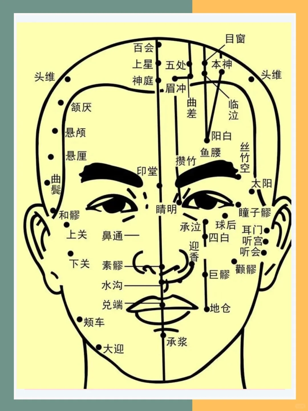 1、 头维 2、发际 3、阳白 4、印堂 5、攒竹 6、鱼腰 7、外明 8、睛明 9、丝竹空 10、瞳子髎 11、承泣 12、球后 13、四白 14、迎香 15、人中 16、地仓 17、承浆