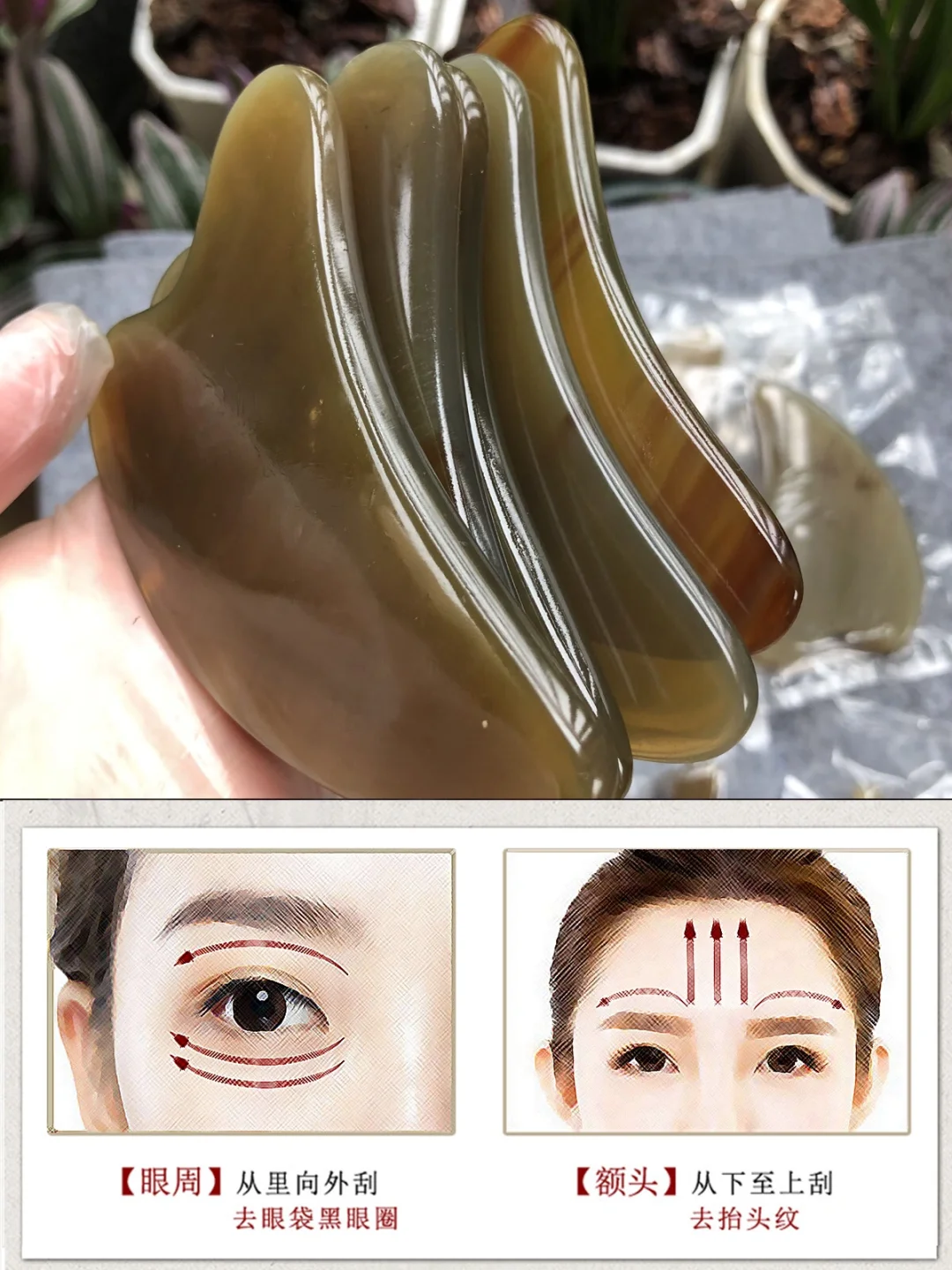 额头中线起点,板和皮肤的夹角5~15度,额中向太阳穴方向,轻手法刮拭10~20次。