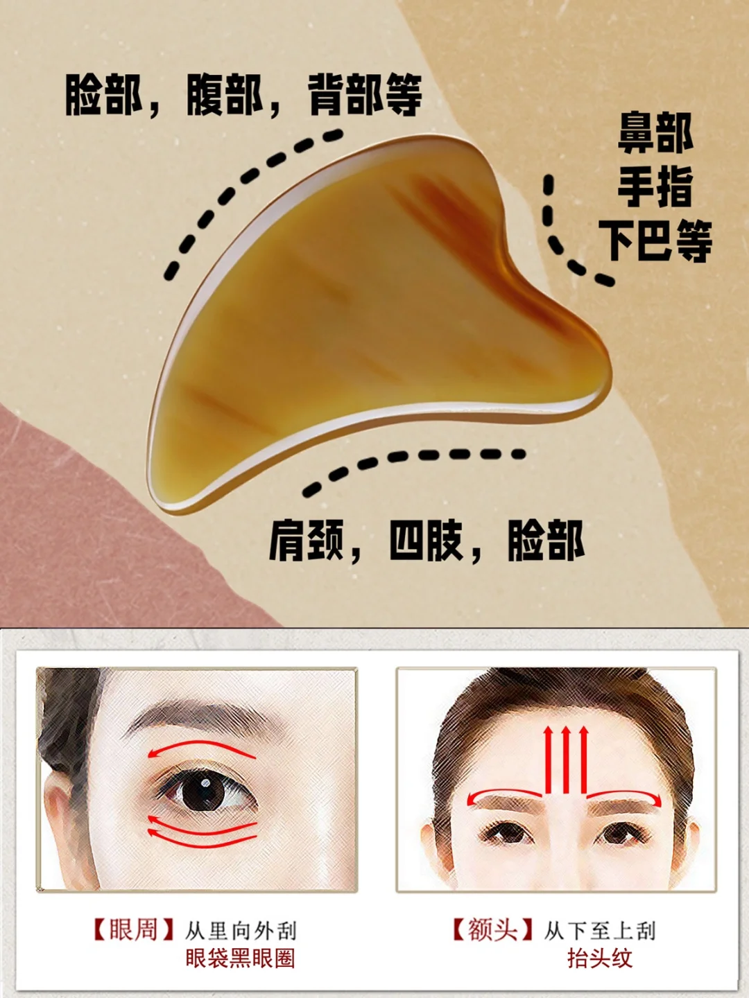 🌸第二步:用板的外弧边来,由下往上刮额头。3次左右。