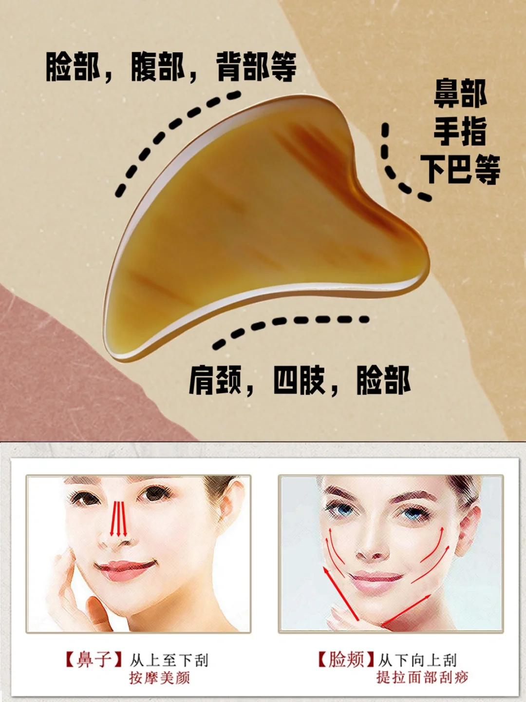 ⚪用板的尾部V槽,从下巴处开始,推到耳前。提升效果。每边三次。