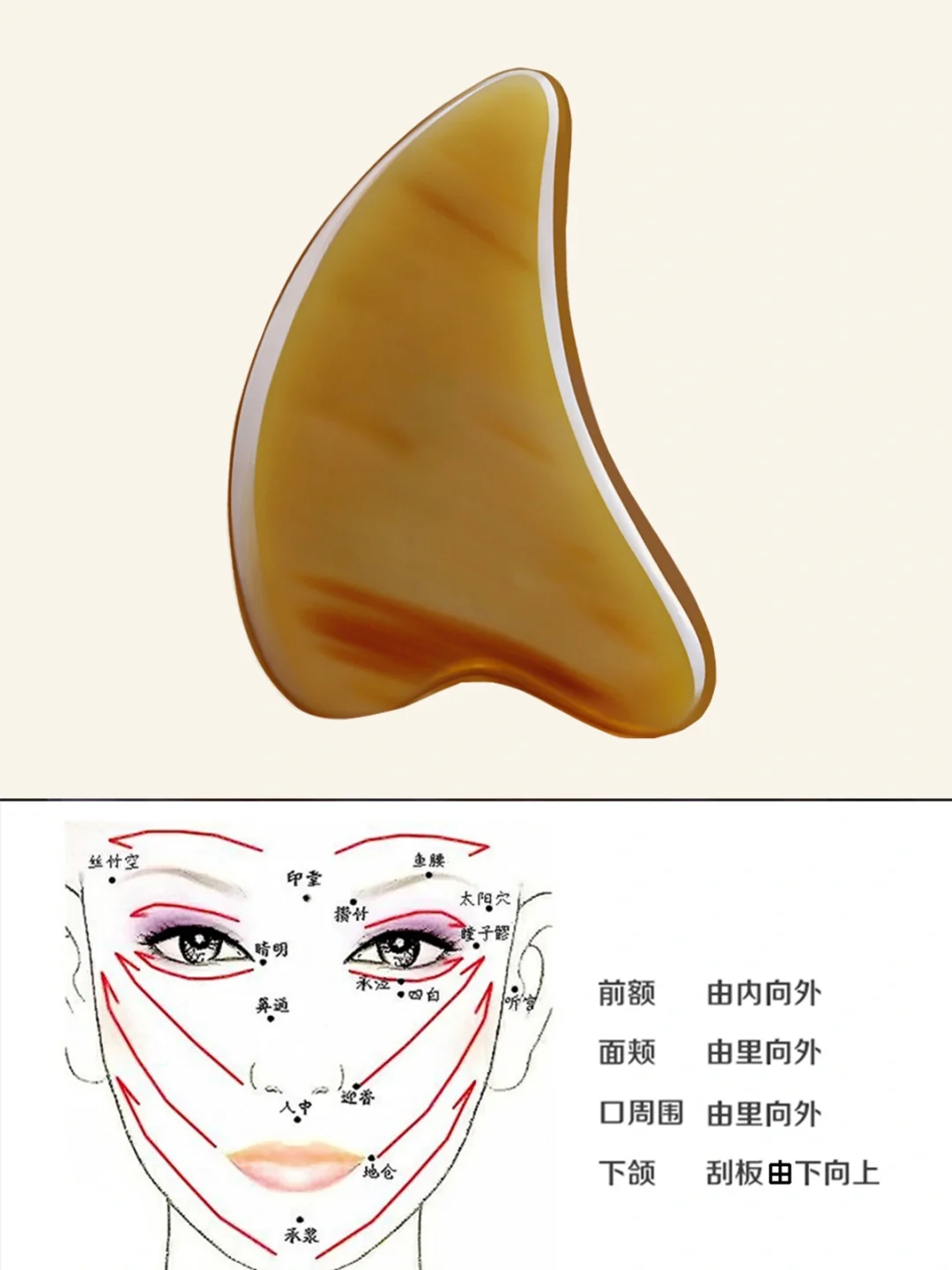 根据人体面部生理结构设计的面部专用刮痧板。