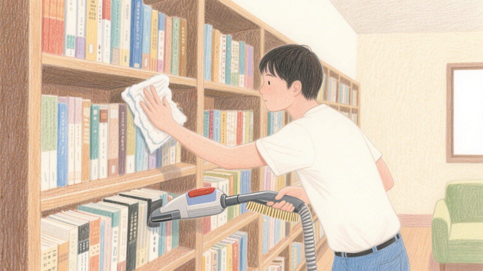 若平时没时间彻底清洁,可每天花 2 分钟快速整理:将随手放回的书籍归位,用干抹布擦去书架表面浮灰,避免灰尘和杂乱长期堆积,减少后续清洁压力。