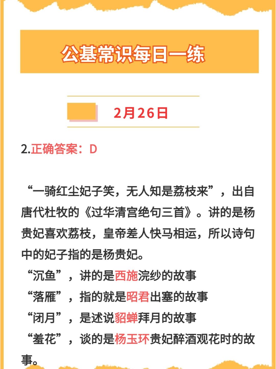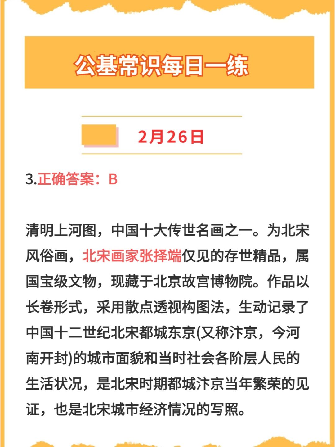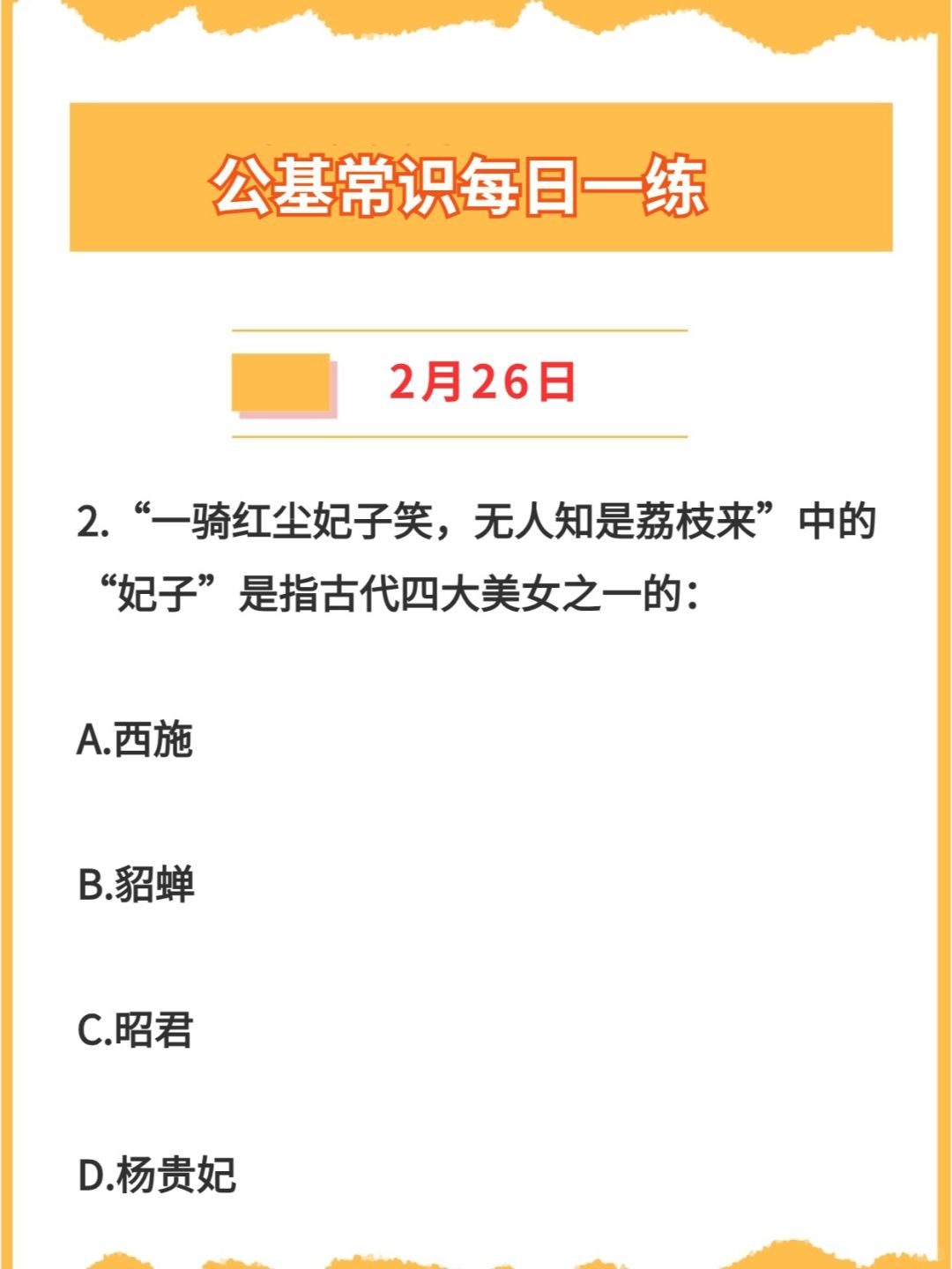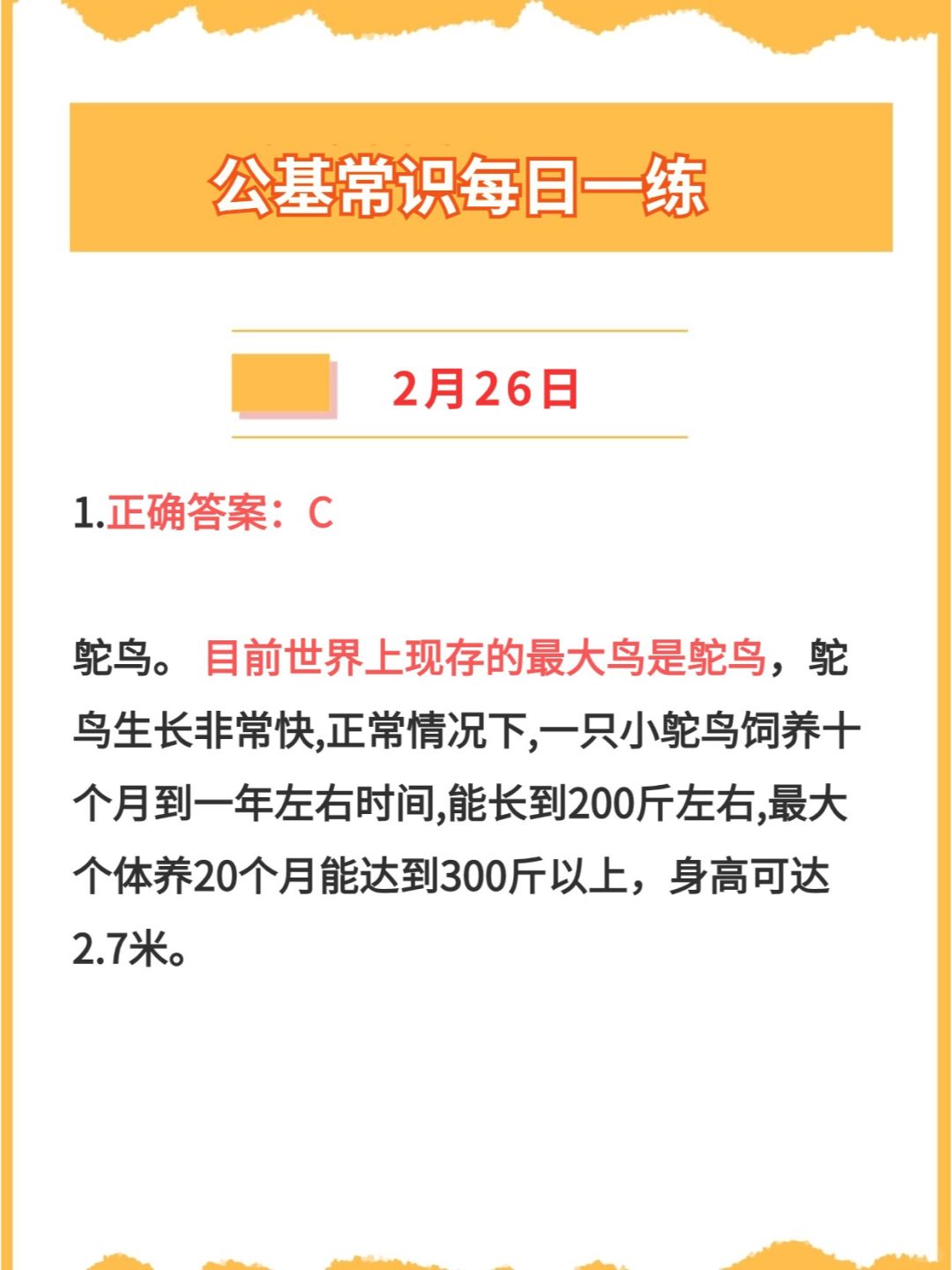 1.目前世界上现存的最大鸟类是? A.秃鹫 B.鸸鹋 C.鸵鸟 D.老鹰 2.《清明上河图》反映了我国哪个朝代的生活: A.唐朝 B.宋朝 C.元朝 D.明朝 3.“一骑红尘妃子笑,无人知是荔枝来”中的“妃子”是指古代四大美女之一的: A.西施 B.貂蝉 C.昭君 D.杨贵妃