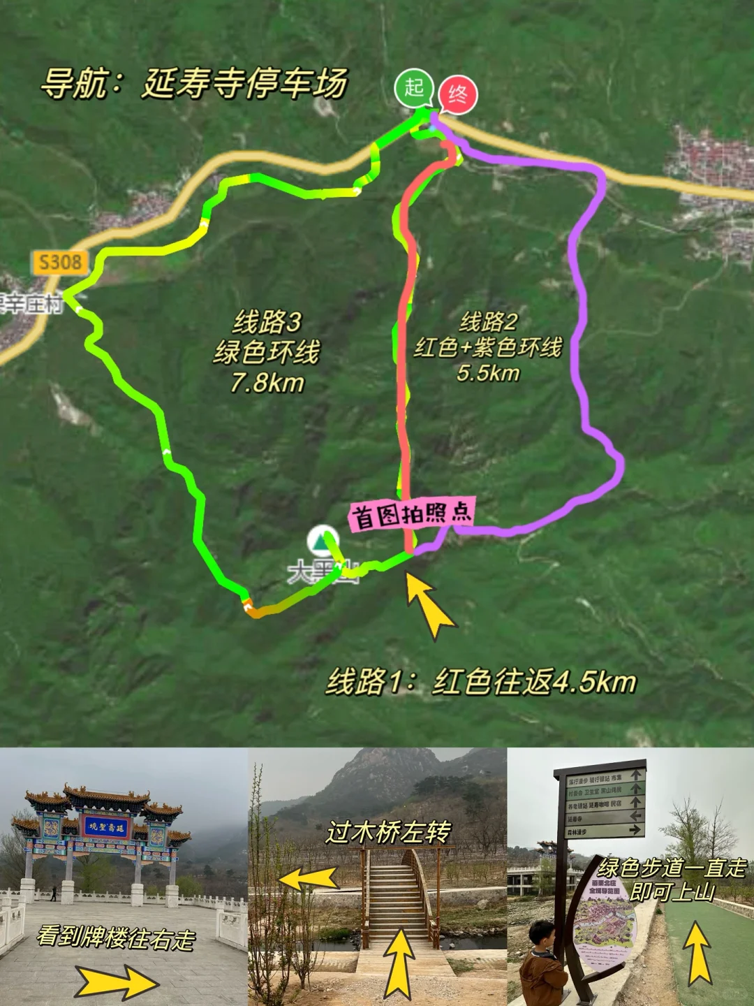 👉🏻停好车往西走看到延寿寺的牌楼,别进去❌过马路,见牌楼继续向前,过木拱桥左转,沿着绿色步道上山,这里就是徒步的起点,见【图二】