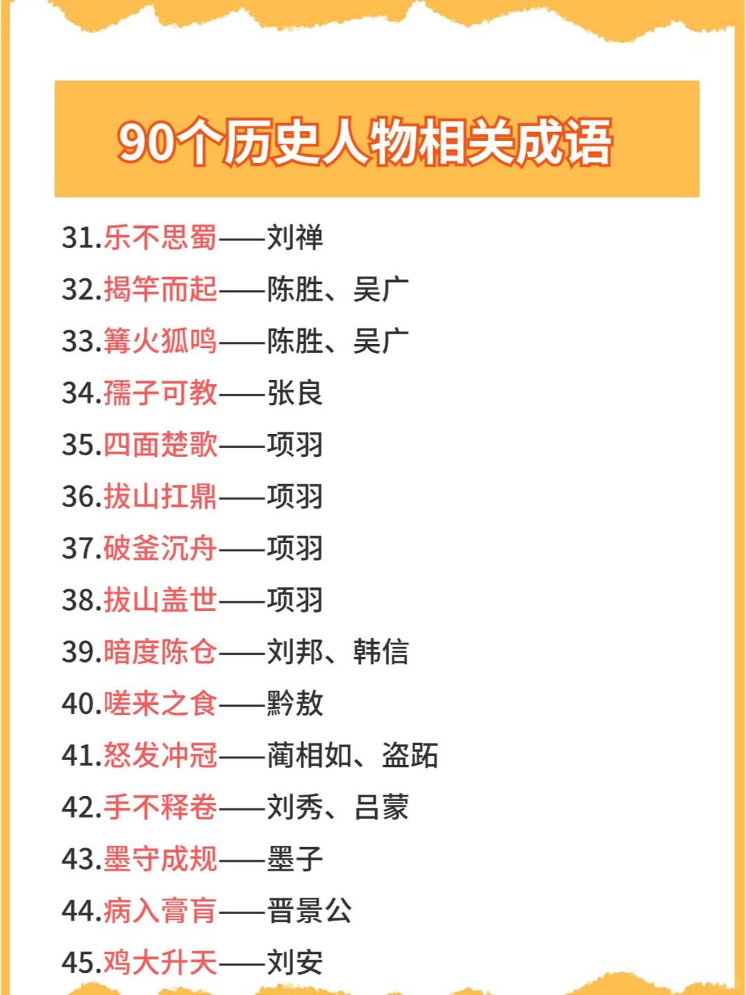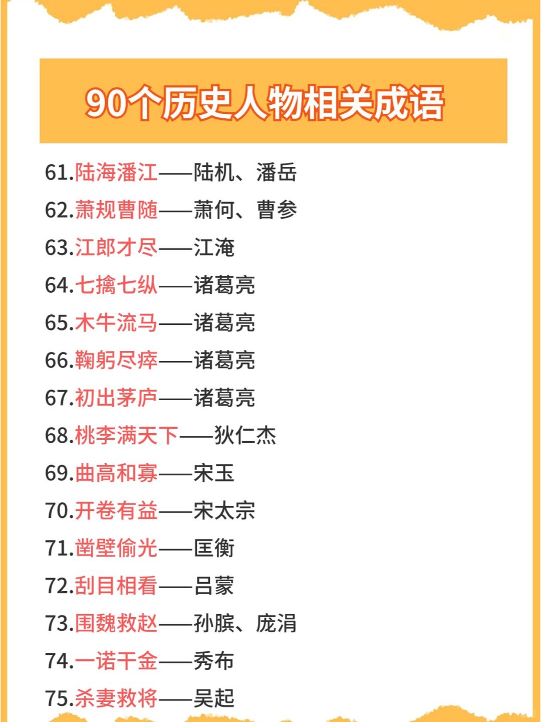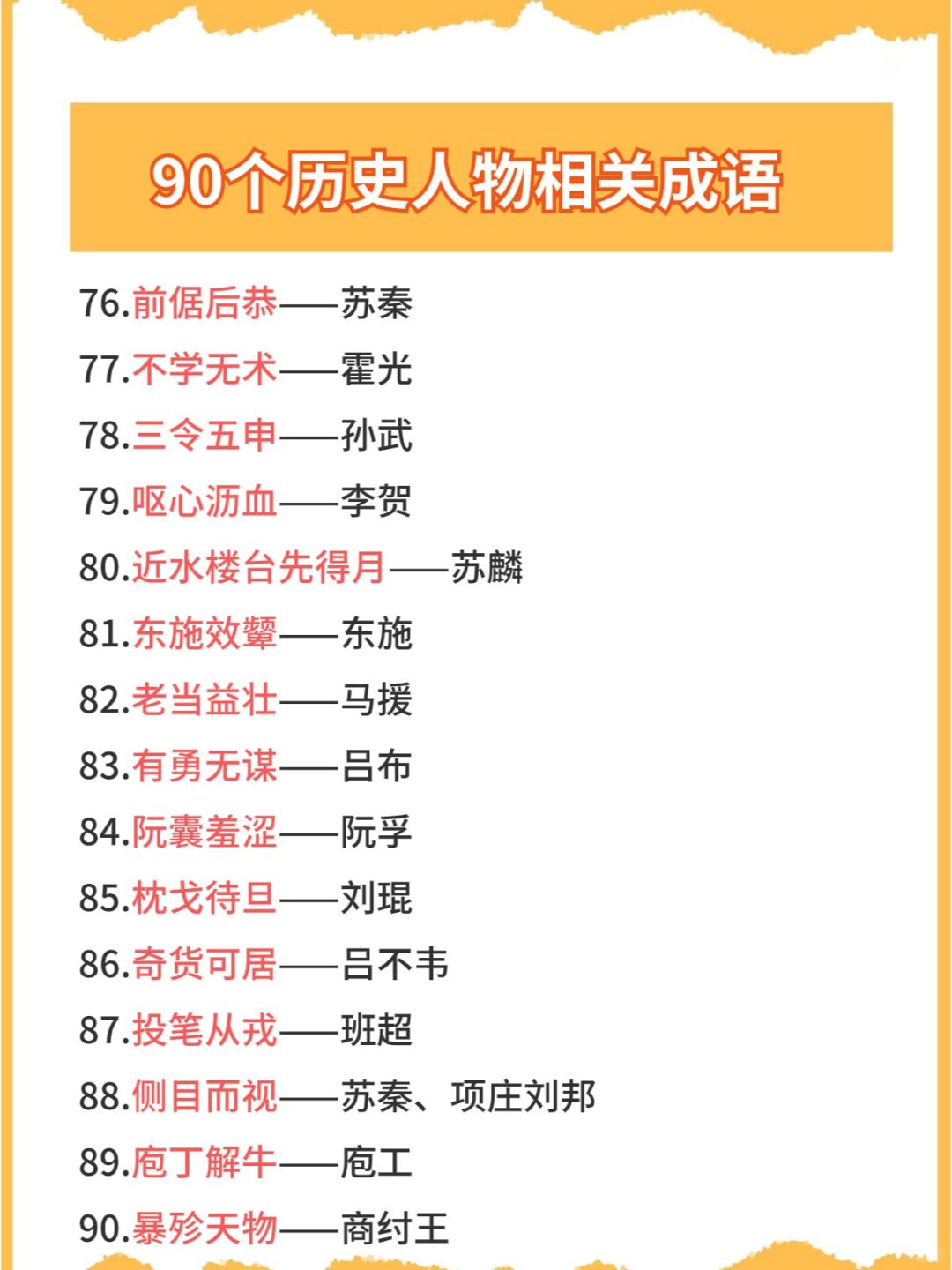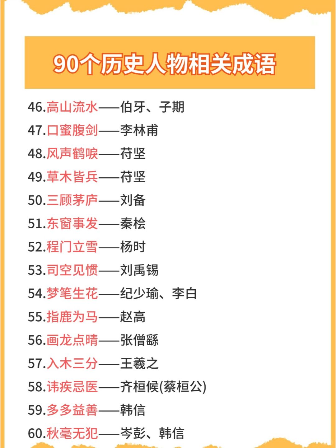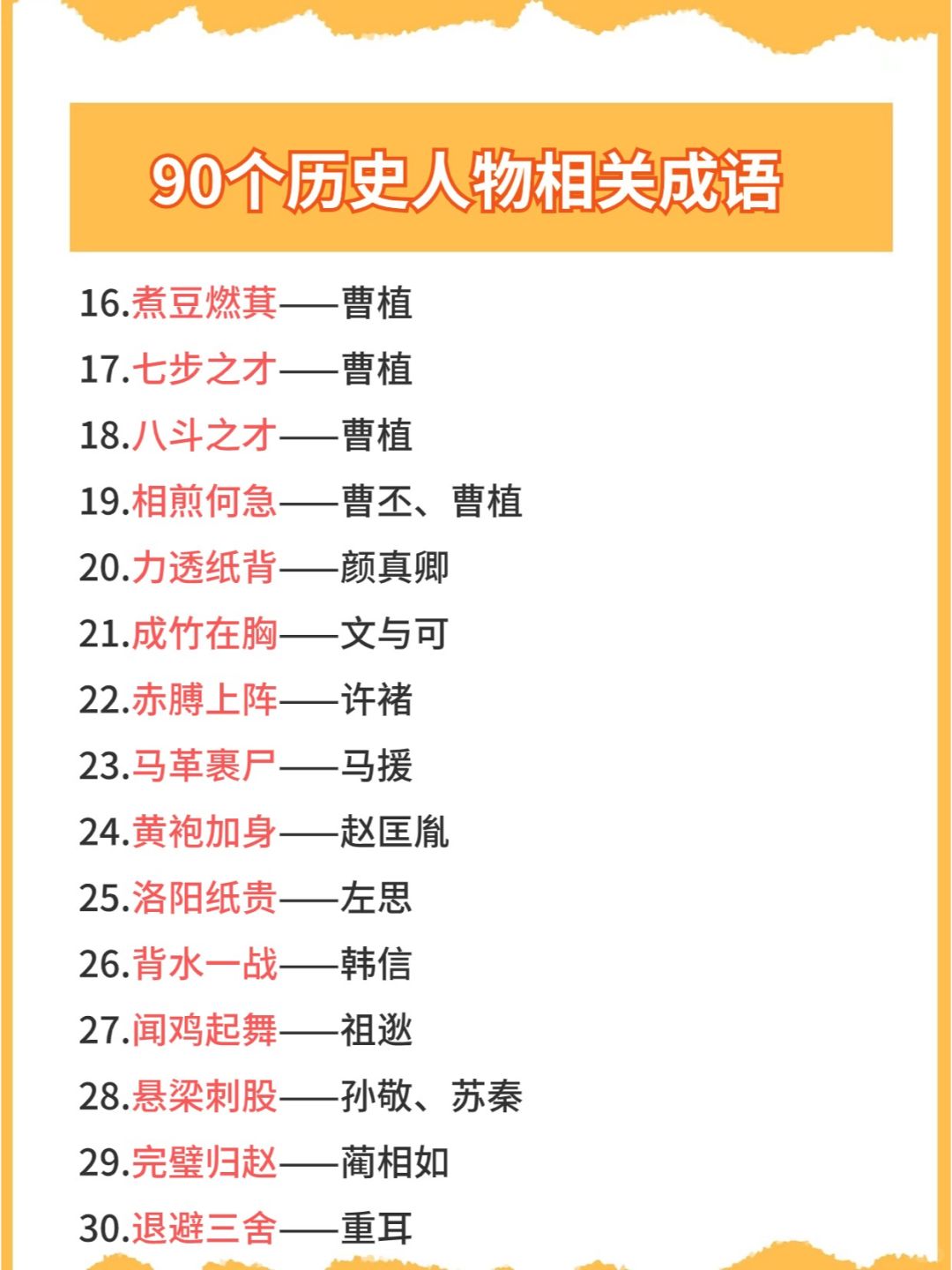 常识积累之——90个历史人物相关成语【简版】这回整理全啦!! 公考省考事业编备考必看哟~ 10.图穷匕见——荆轲 11.纸上谈兵——赵括 12.负荆请罪——廉颇 13.卧薪尝胆——勾践 14.老骥伏枥——曹操 15.望梅止渴——曹操 16.煮豆燃萁——曹植 17.七步之才——曹植 18.八斗之才——曹植 19.相煎何急——曹丕、曹植 20.力透纸背——颜真卿