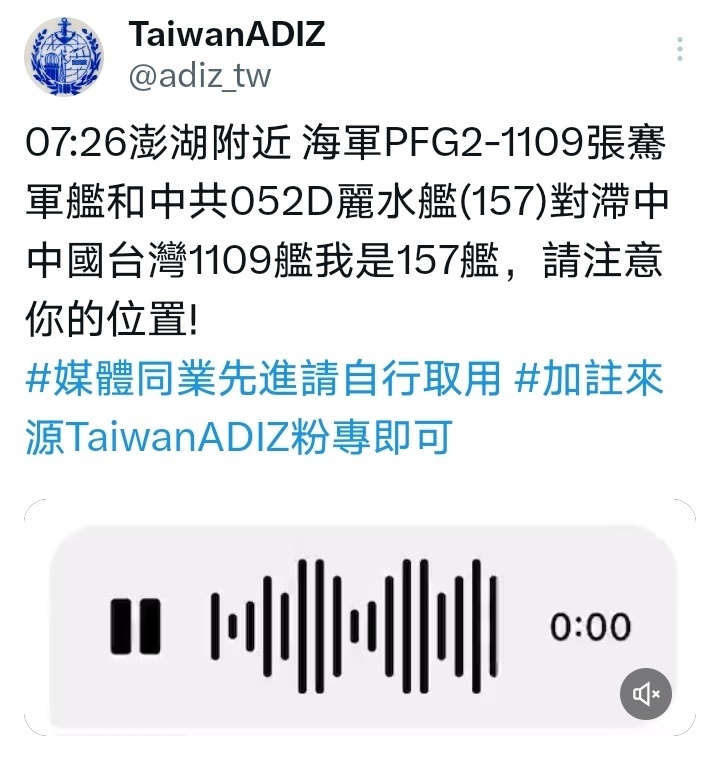 #台海局势#今天(22日)上午7时许,台湾澎湖附近, 台海军1109张骞舰和解放军157丽水舰对峙中,台网友发布喊话录音。