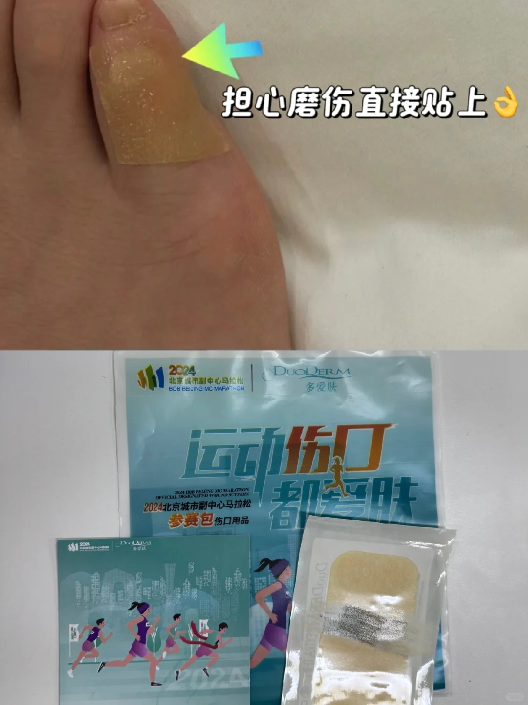 3.摩擦起伤的安全保障!赛前使用防磨贴隔绝皮肤与衣物鞋子来减少摩擦刺激。长距离的跑步即使跑鞋再合适,脚上或者肢体之间的摩擦是避免不了的,比如男性胸前敏感部位、男女性的背心/bra腋下位置,脚趾或脚后跟与鞋摩擦的部位,都是常见的摩伤位置;这次北副马的参赛包中就准备了这种多爱肤水胶体敷料,出乎意料的贴心,挺薄的一片,想要多少自己裁就行,我就直接裁了合适大小的贴在脚后跟处了,整场马拉松跑下来都没卷边,赛后换了拖鞋冲脚忘了揭下来,也没掉,贴的很牢还能防水;它不仅可以防磨,跑马过程中如果有摔伤擦伤也是可以用的,这个是湿性愈合的,贴上后不容易结痂,皮肤没有紧绷拉扯感,继续跑步不受影响。