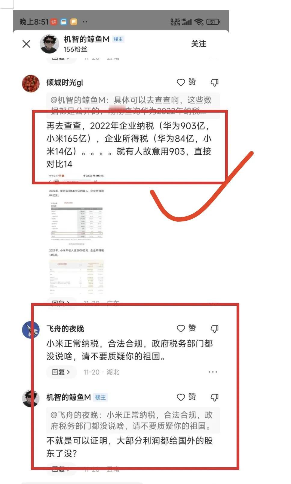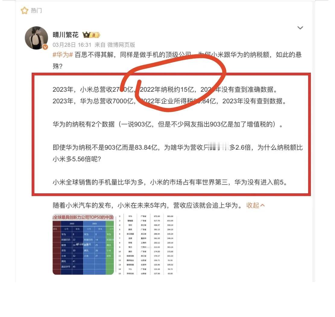 小米刚刚又被翻出来开曼群岛避税问题?这一次真相来了,这个问题不容忽视! 这几天陆续看到不少自媒体发文对比华为和小米的纳税数据,例如不少自媒体内容中提到华为在2022年总营收达到了6400亿,贡献了903亿的税收;而小米在2022年总营收为2800亿,却只有14亿税收,并且借此发挥小米公司避税甚至逃税的问题。 那么这里自媒体引用的数据是否真实?真相又是如何?经过笔者查证,果然发现了问题所在。来自工商联网站数据,其实华为纳税总额903亿是2020年的数据,而同期小米纳税总额为165亿,远非此前自媒体内中所提及的14亿。 在2021年,华为贡献了所得税为82.27亿,同期小米贡献了所得税为51.33亿。如此对比下来,不难看出无论是华为还是小米,均为本土优秀的科技龙头,无论是对税收贡献还是就业贡献,特别是对科技研发推动均起到了助力。 对于不少自媒体或者采取张冠李戴的方式,拼接内容,以此达到其他目的,这样的情况不容忽视,希望大家还是要求真求实!