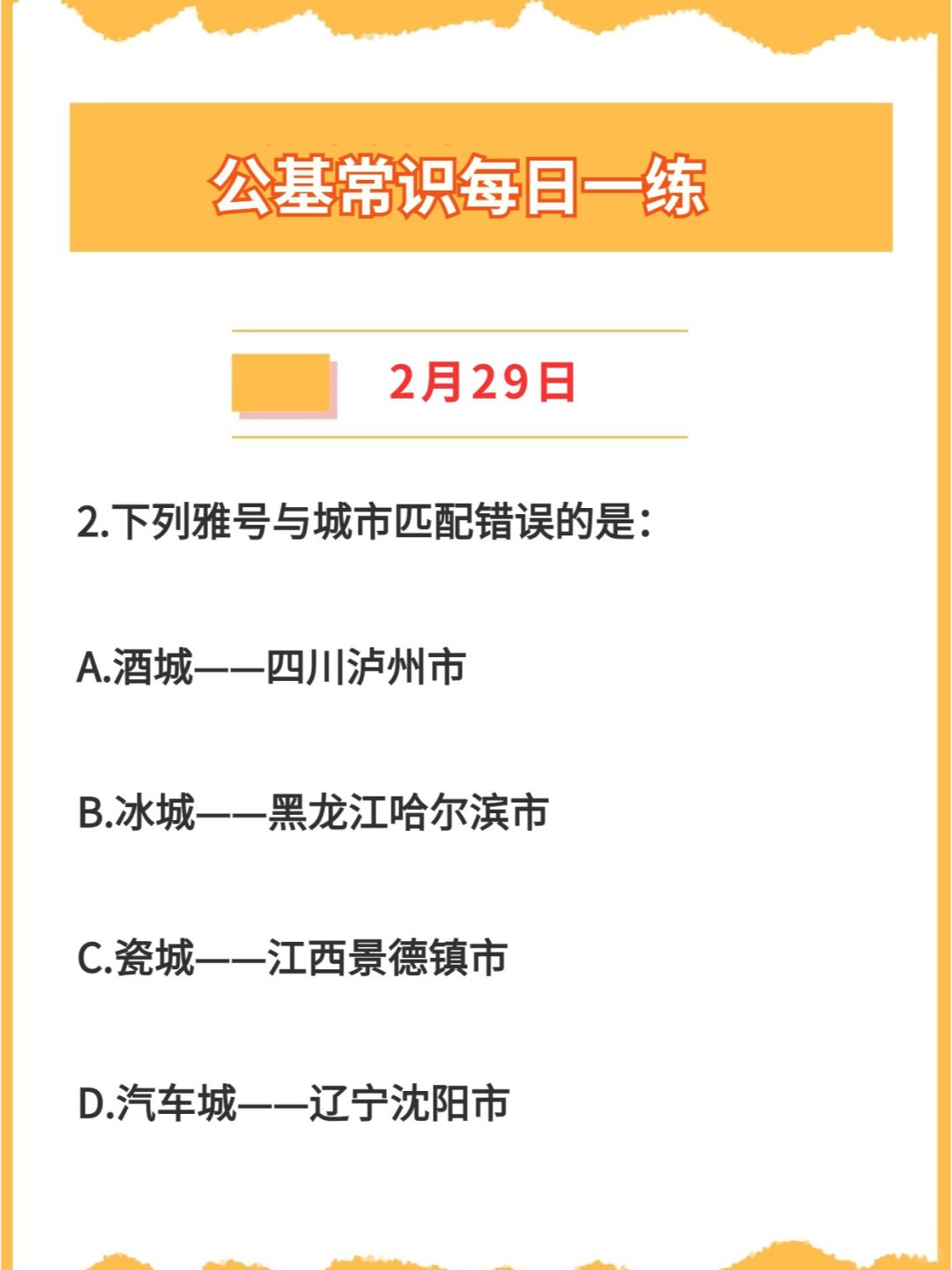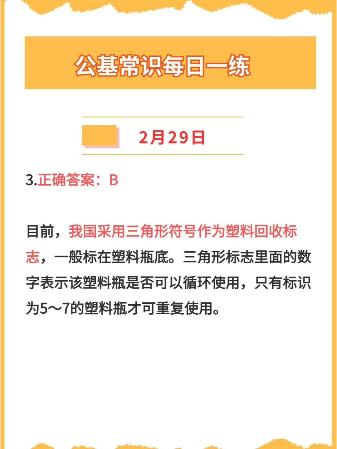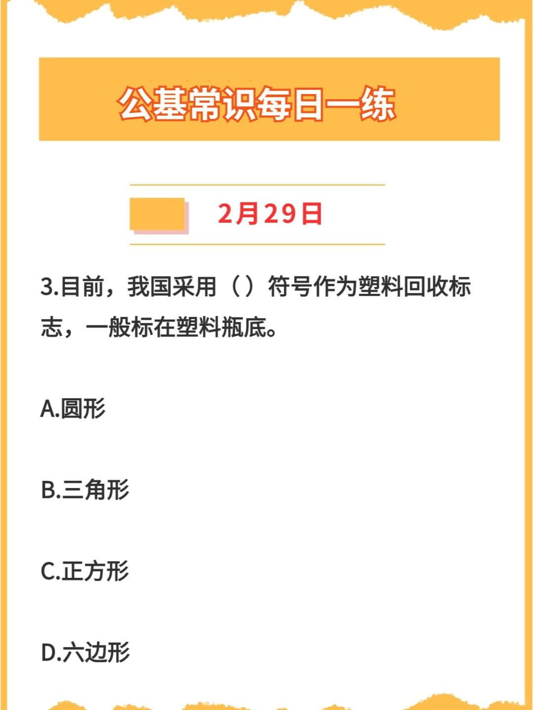 1.50元纸币背面的风景图案是: A.黄河壶口瀑布 B.布达拉宫 C.桂林山水 D.泰山 2.目前,我国采用( )符号作为塑料回收标志,一般标在塑料瓶底。 A.圆形 B.三角形 C.正方形 D.六边形 3.下列雅号与城市匹配错误的是: A.酒城——四川泸州市 B.冰城——黑龙江哈尔滨市 C.瓷城——江西景德镇市 D.汽车城——辽宁沈阳市