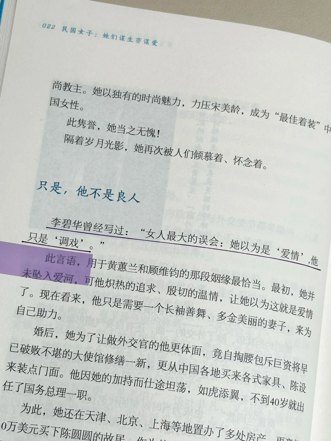📖在这本书中,作者着墨于民国年间的19位名媛才女,潘玉良、张幼仪、陆小曼、林徽因、胡蝶、阮玲玉、萧红、张爱玲...一个个靓丽的身影就这样在作者笔下“活”了过来。读罢她们的故事会发现,原来聪慧如她们,也会在错误的感情里困顿,在人生的弯路上迷茫,也会遭遇种种挫折、重重困难。