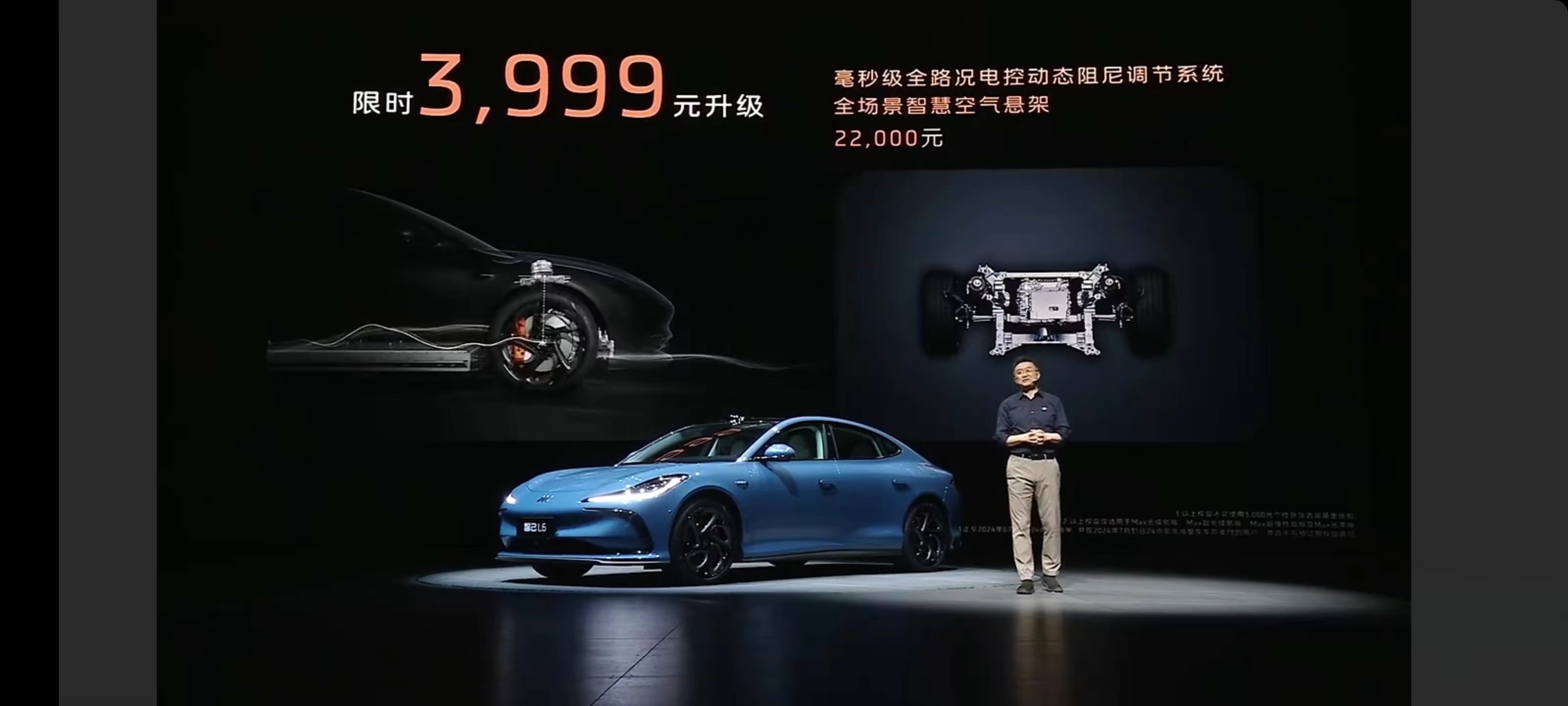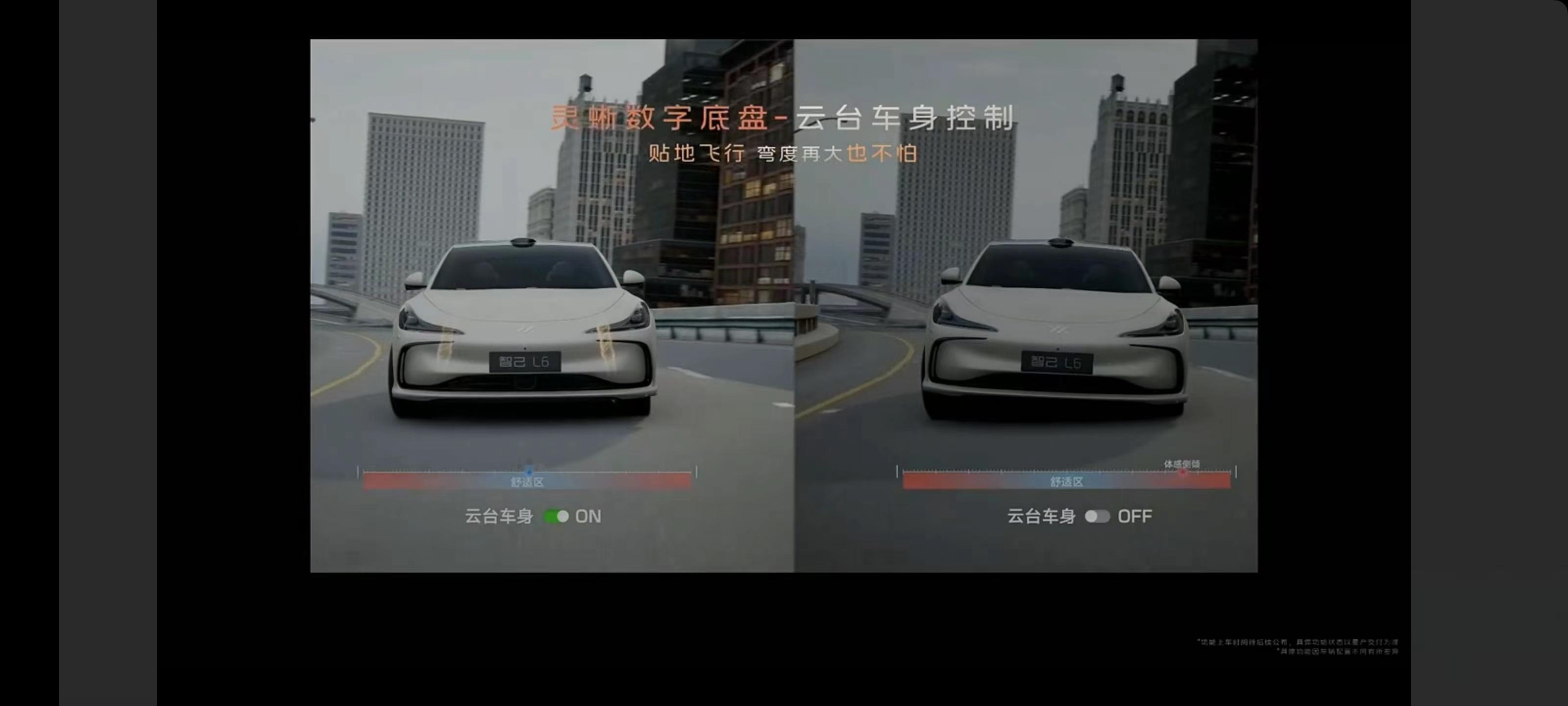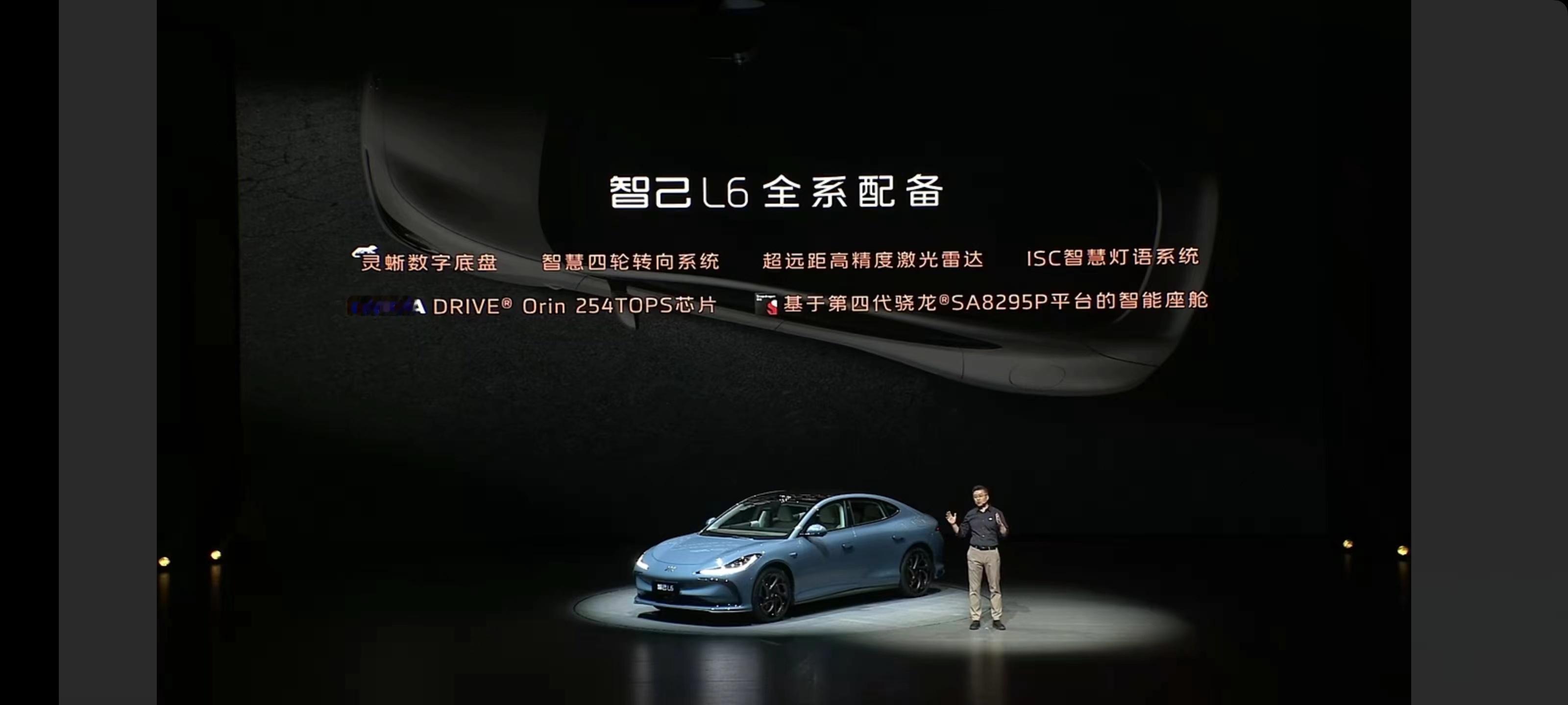 智己L6全系配备灵蜥数字底盘,四轮转向系统,最小转弯半径4.99米;ISC智慧灯语系统,基于骁龙8295P打造的智能座舱,智驾方面标配英伟达Orin芯片和超远高精度激光雷达,将在年内开通无高精地图的全国范围智驾功能。