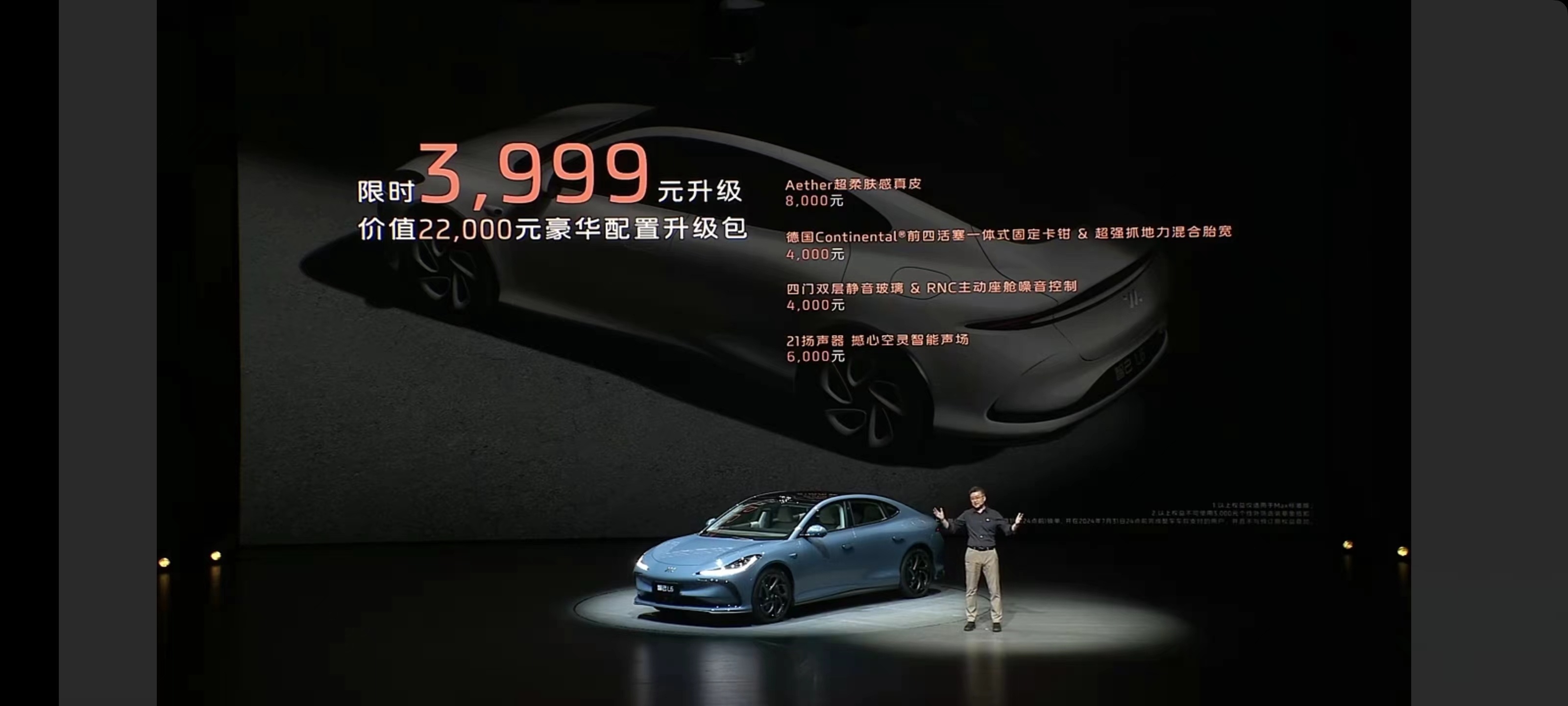 车型可以选装豪华配置升级包,包括Aether超柔肤感真皮,前四活宴一体式固定卡钳 , 超强抓地力混合款胎,四门双层静音玻璃 ,RNC主动座舱噪音控制,21扬声器智能声场