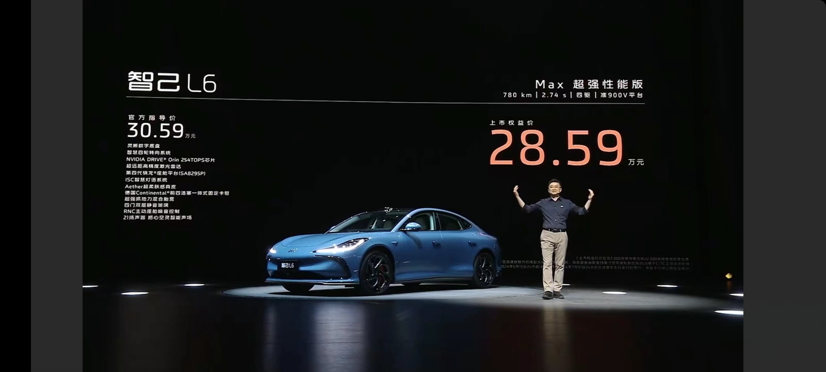 L6 Max超强性能版双电机功率为前200kW/后379kW,总功率787Ps,扭矩为800N·m,零百加速2.74s,匹配100kWh三元锂电池包,CLTC续航里程780km。