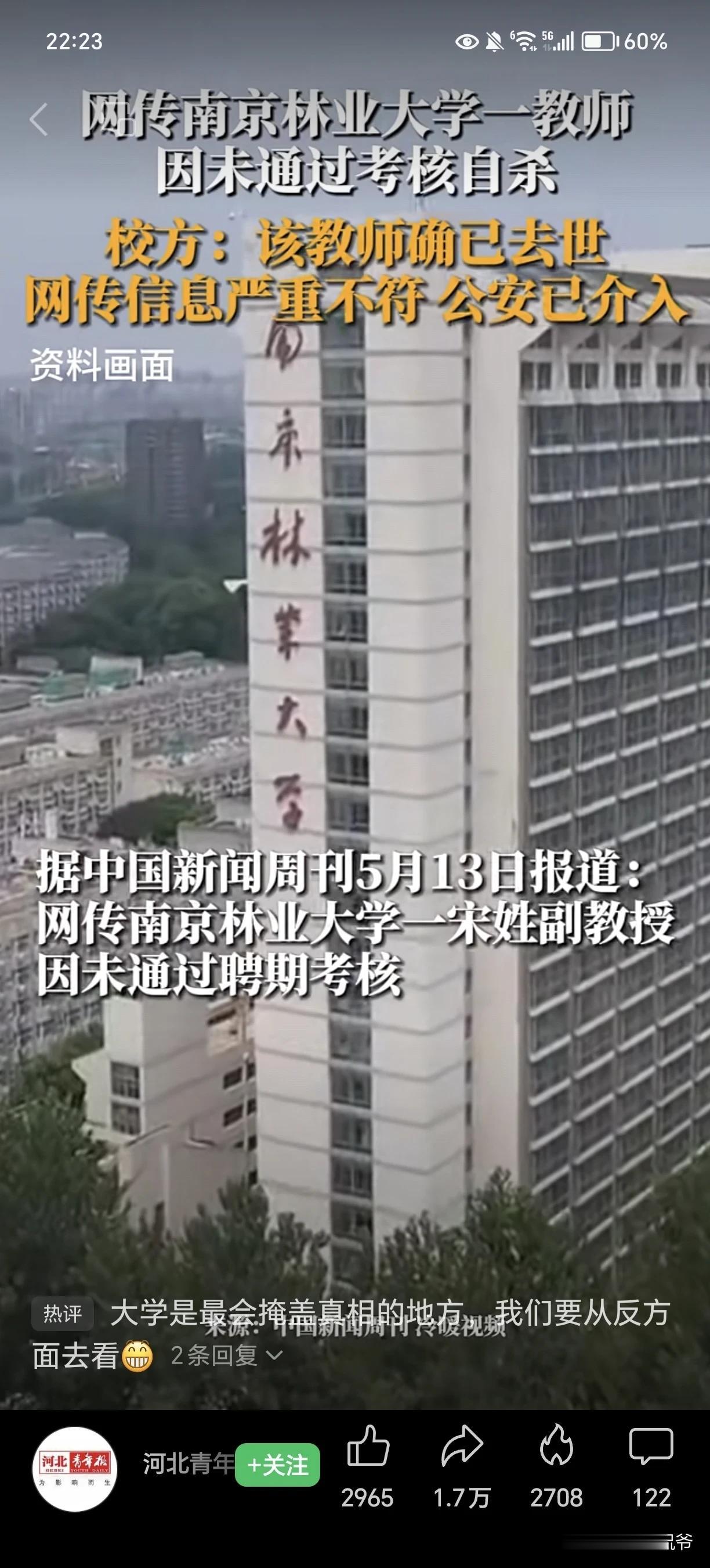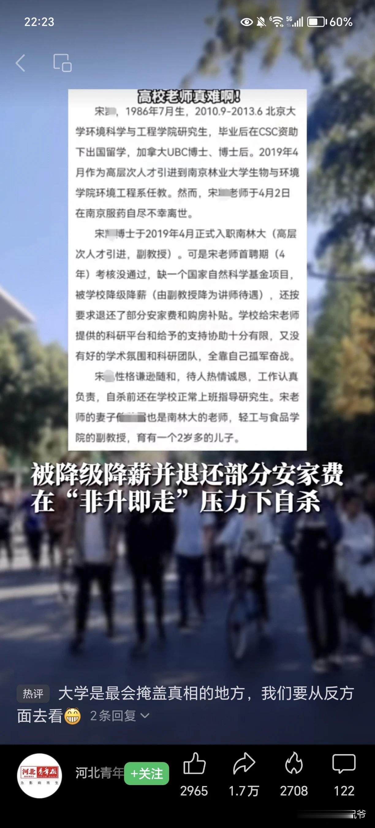非升即走好,清除南郭先生//近日,网传南京林业大学教师未通过考核被降级降薪后自杀了,令人痛心!在我看来,当下一些高校的科研氛围:一要有冷板凳坐穿的精神;二是非升即走。这种急功近利的风气,容易导致大量应急主义的科研成果,让高校教师没有心思去搞见效慢的基础研究,长此以往,必然会影响到整个教育科研的健康发展。#高校教师的心酸##南京林业大学#