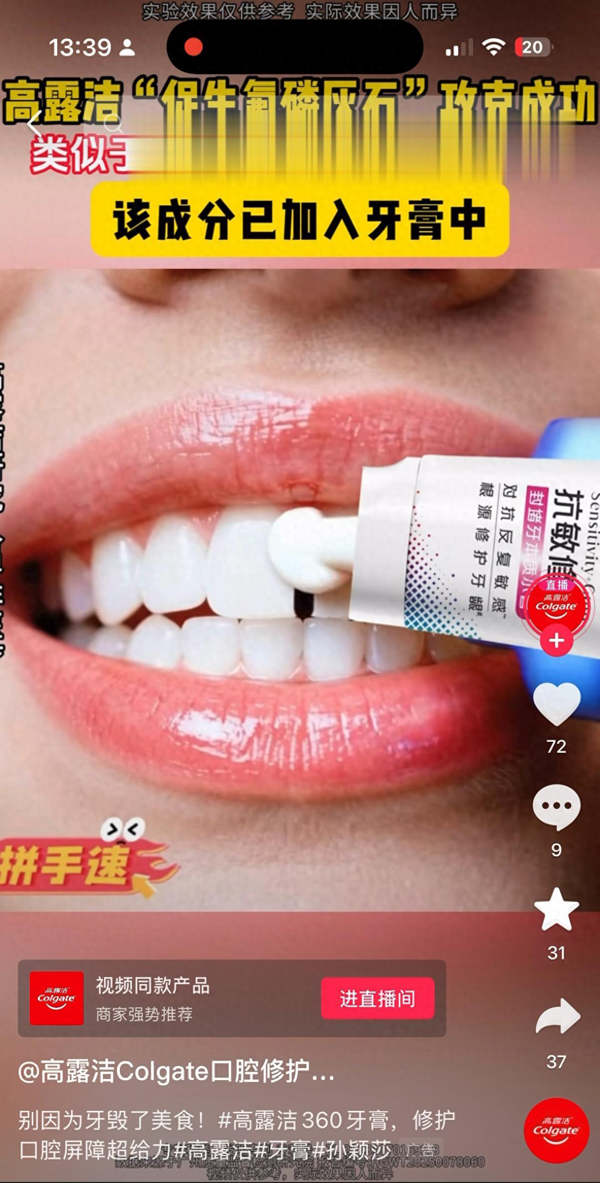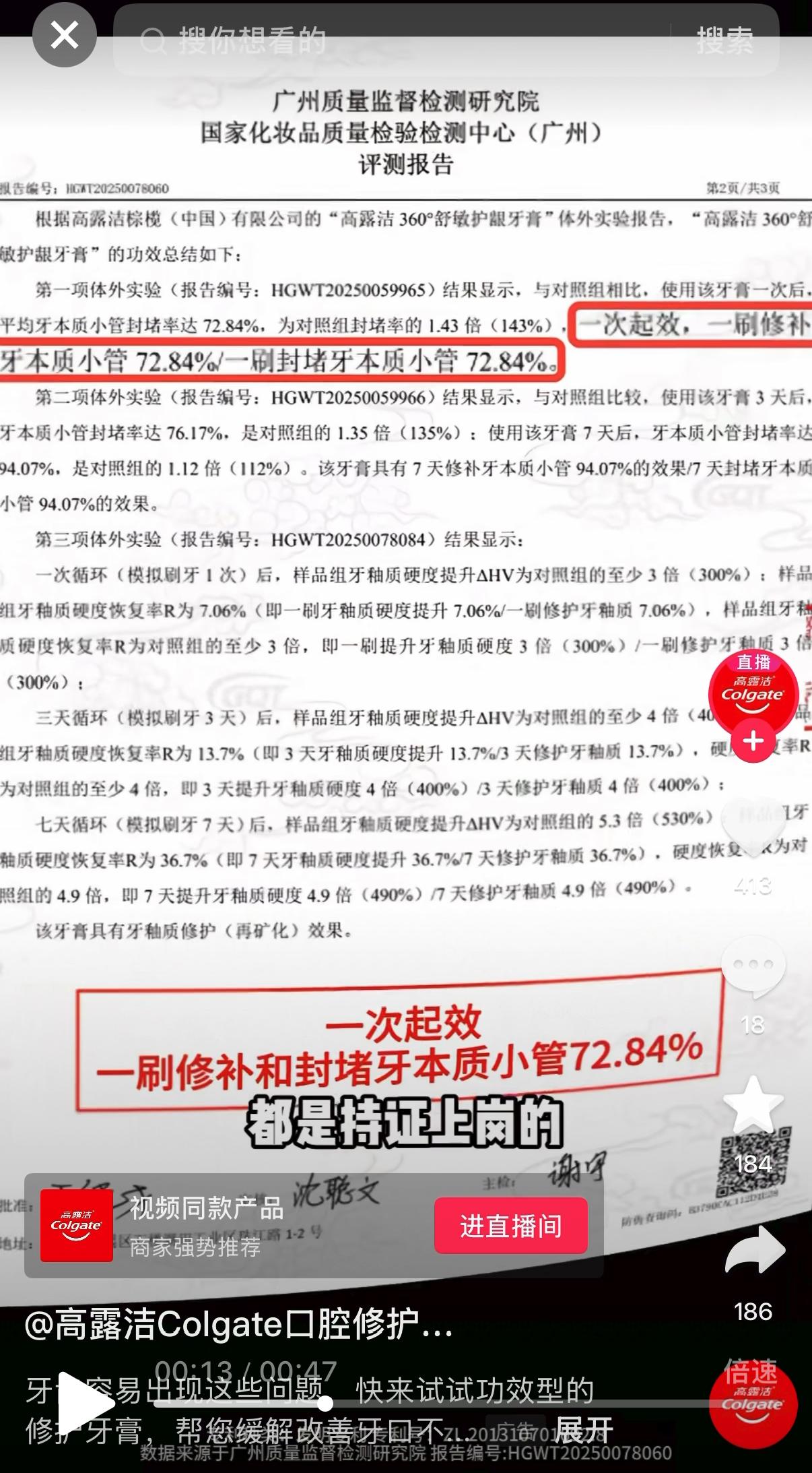 记者在调查中发现,“高露洁Colgate口腔修护牙膏直播间”发布的多条短视频中,一条短视频直接标注“没洞真别用”;在开篇动画中,还将高露洁360°抗敏修复牙膏挤在严重缺损的牙齿上,牙齿立马修复如初,并配音“从来没有见过一种牙膏敢这么狂,敢直接把‘一次起效,一刷封堵牙本质小管72.84%’打在检测报告上,都是持证上岗的”。