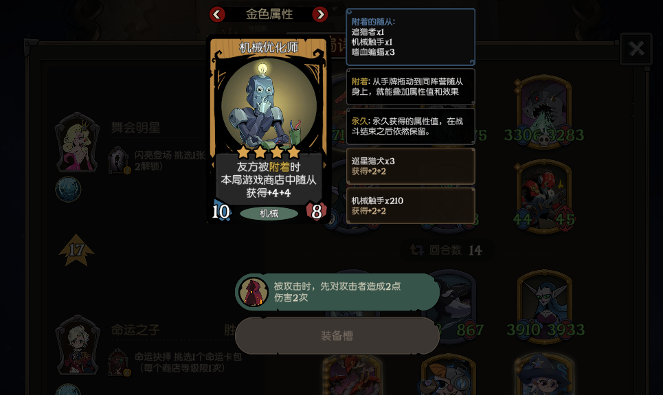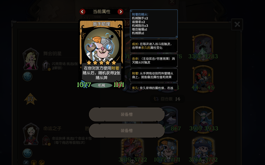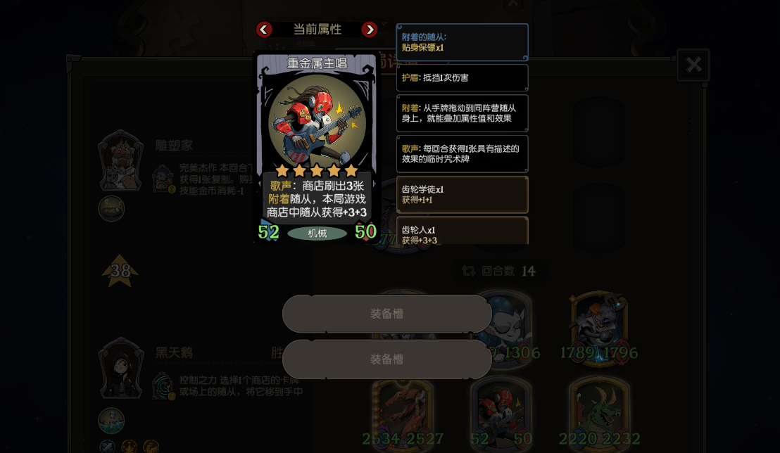 前期主要是提升战斗力阶段,可以用数据收集者打工,也可以用机械化妆师刷一下商店随从的身材,等拿到扳手学徒,就可以开始倒转了,重金属主场的歌声效果每回合都可以提供稳定的附着牌所以很难断电,战斗力提升也比较顺滑。