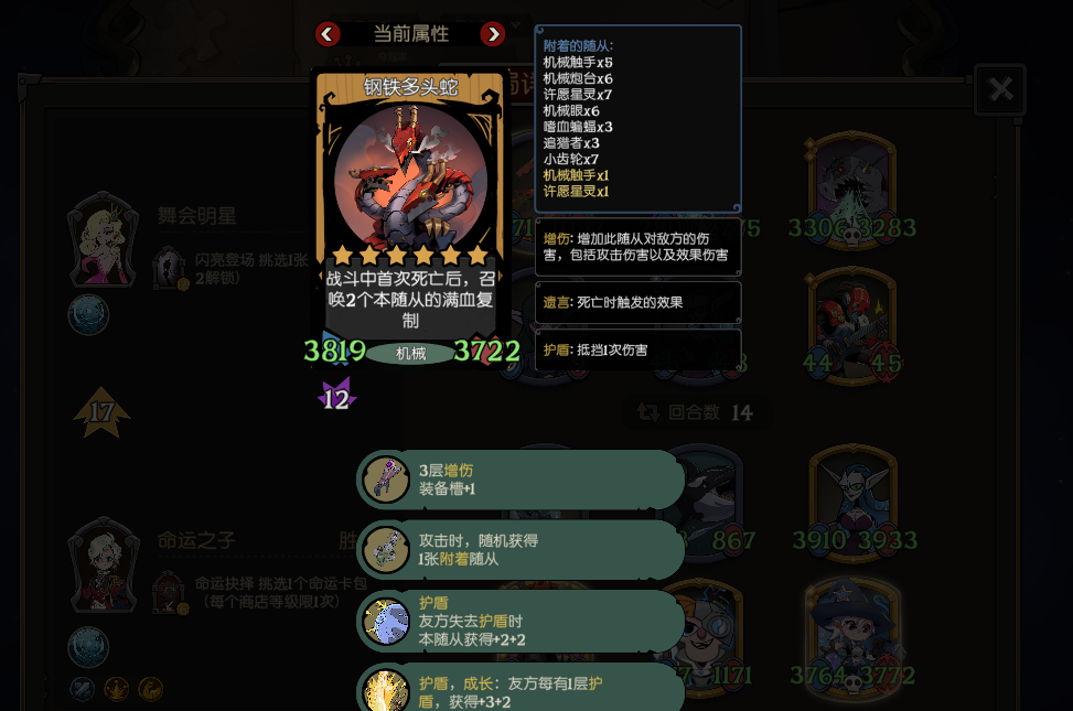 阵容方面,扳手学徒肯定是要有的,这也是贴膜流倒转的核心,然后就是战力牌,最好的选择就是钢铁多头蛇,带上多盾以后战斗力直接翻几倍,最后就是星系建筑师,可以让所有的牌都享受附着的效果。
